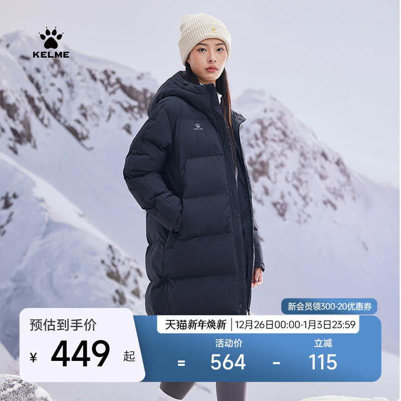 KELME卡尔美长款连帽棉服女士冬季足球训练运动棉衣保暖加厚外套