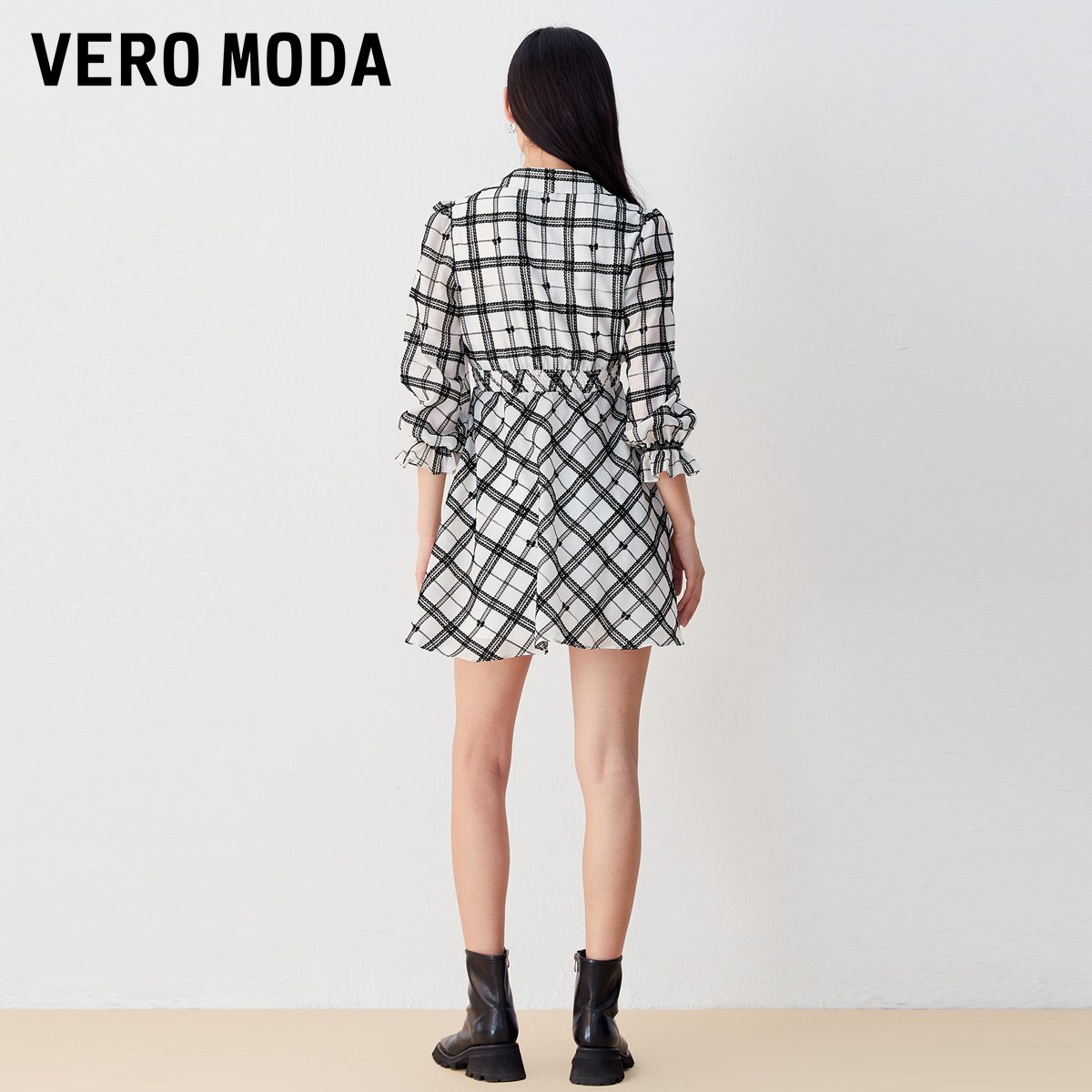 格纹图案,可拆卸串珠蝴蝶结装饰,V领