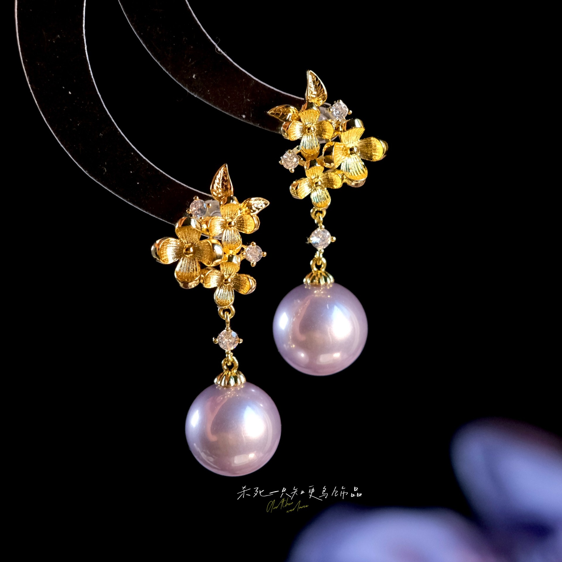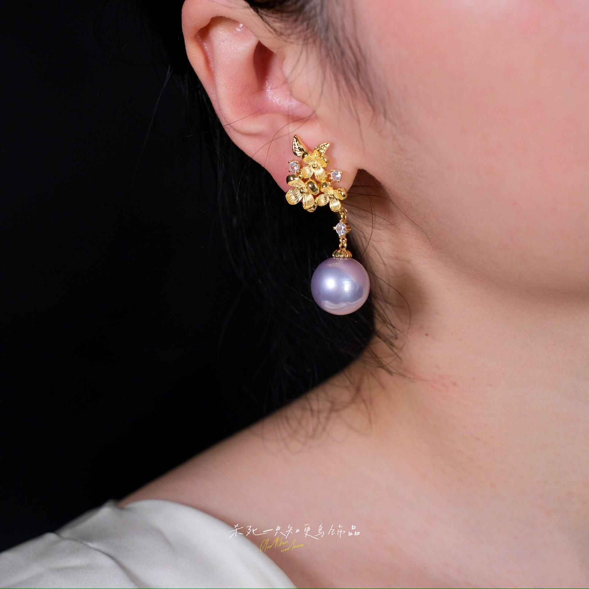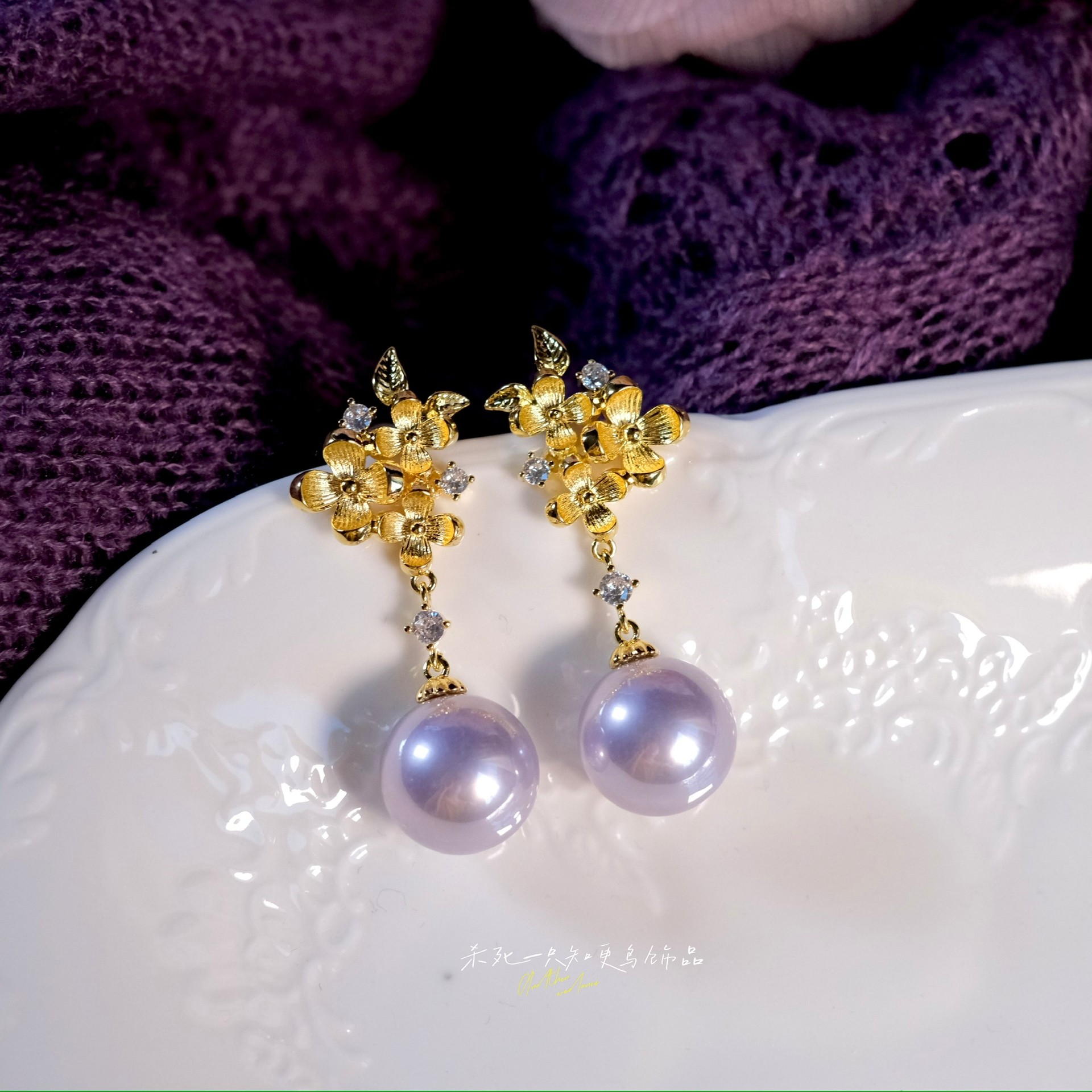《紫雾花海》复古小众高级感薰衣草紫珍珠金色花朵耳环耳夹耳饰女