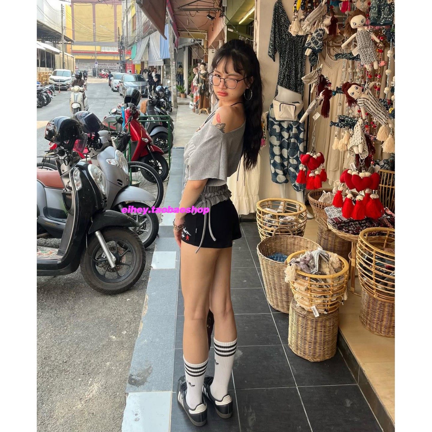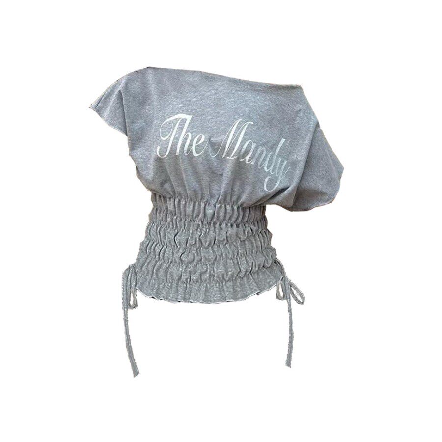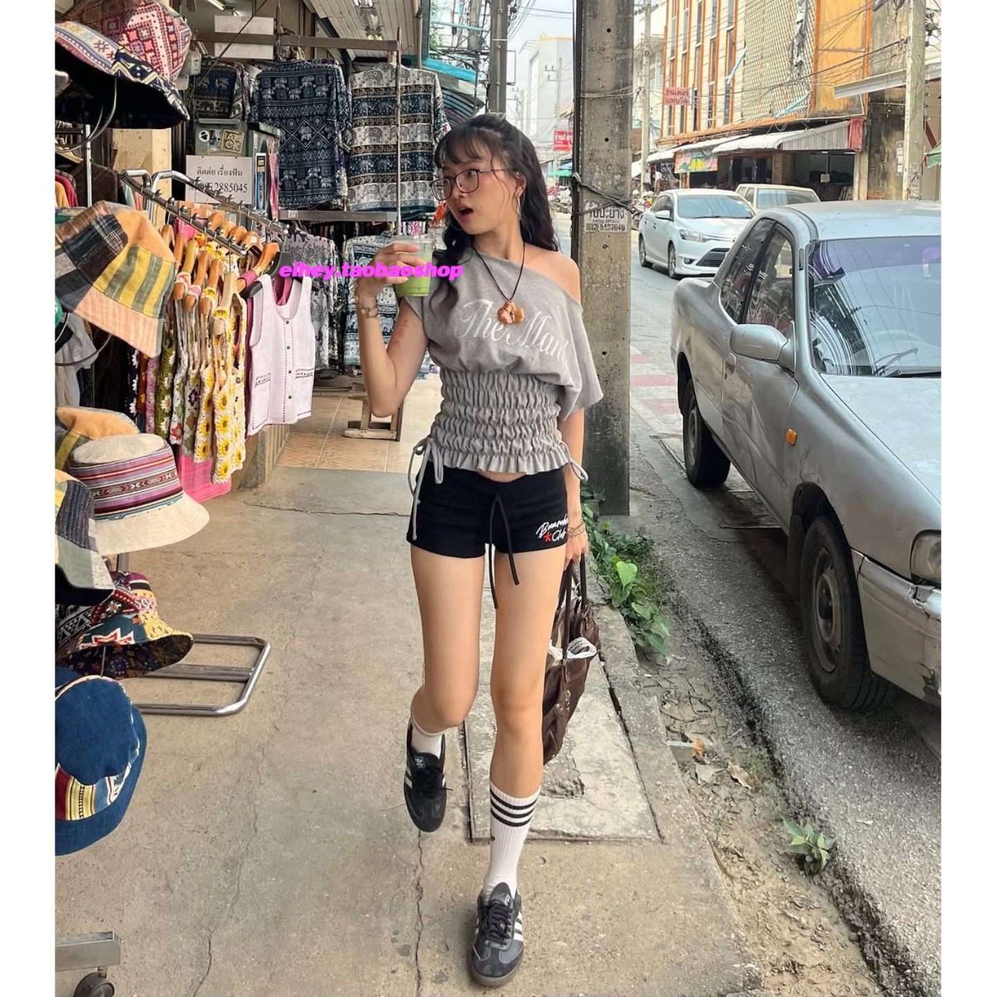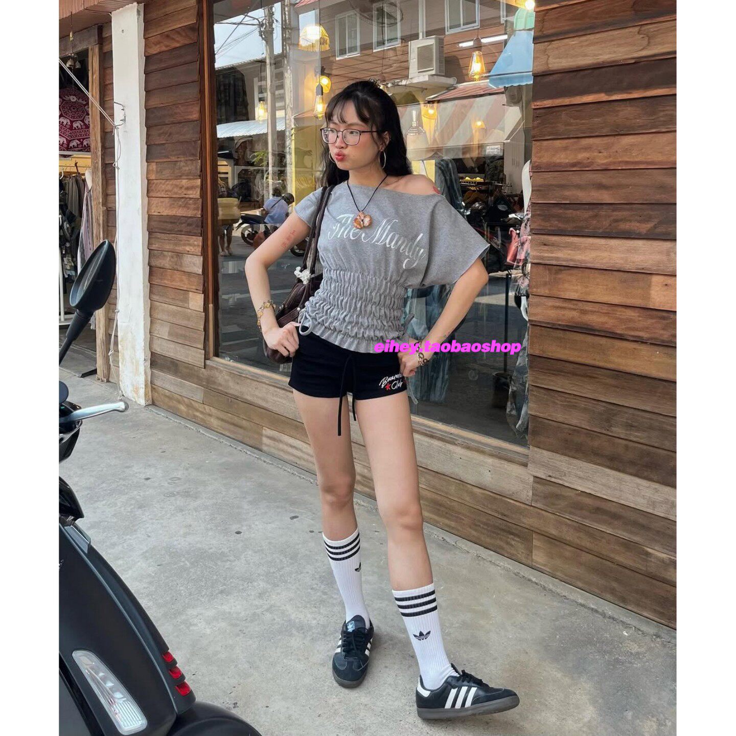 eihey诶嘿美式街头斜肩字母印花短袖t恤泰国穿搭打揽收腰显瘦上衣