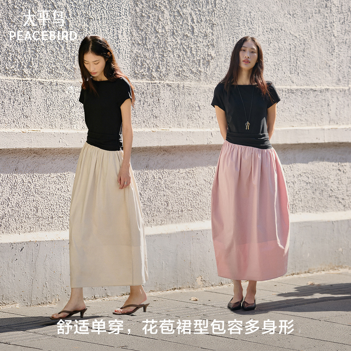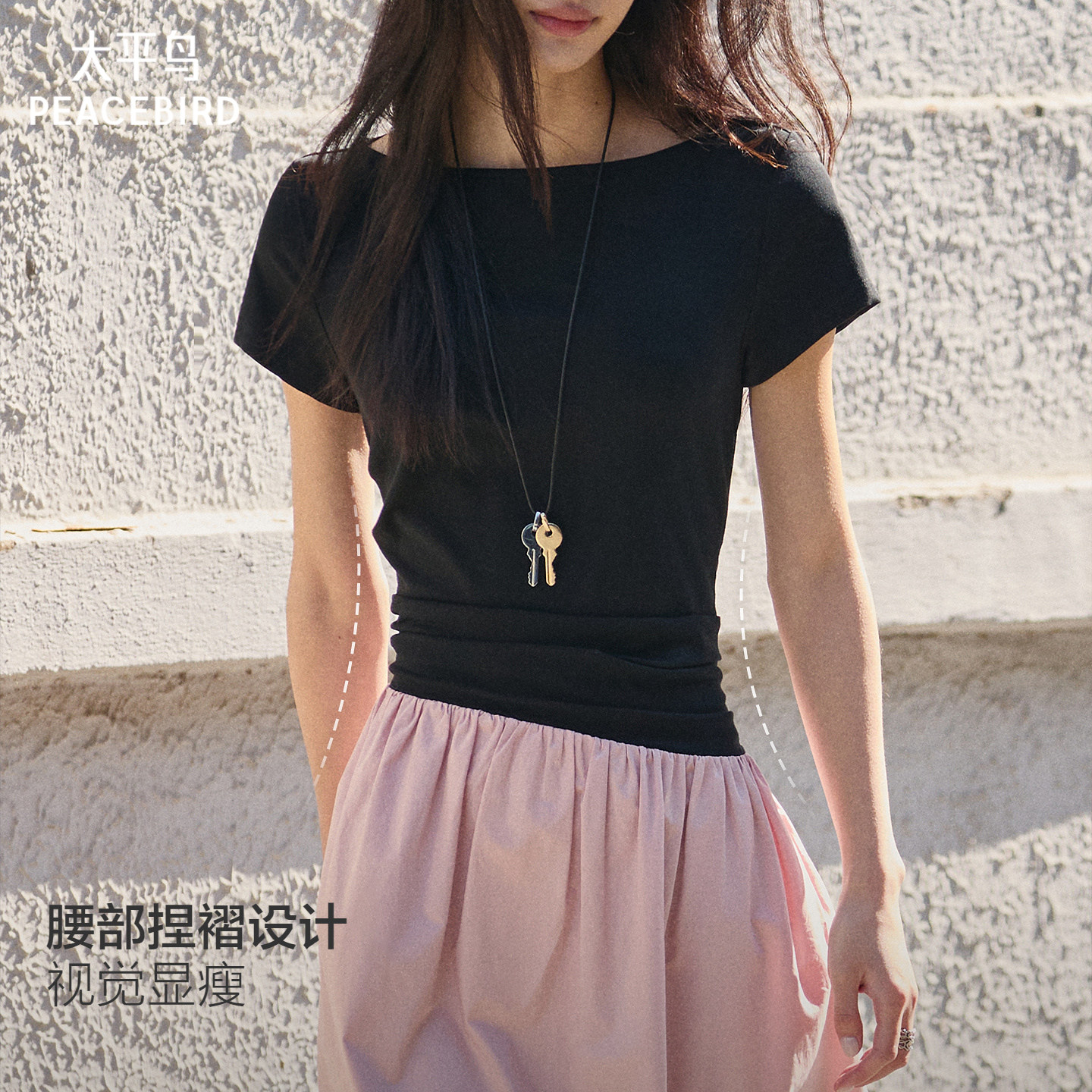 太平鸟郁金香花苞连衣裙假两件春装新款船领通勤连身裙品质感短袖
