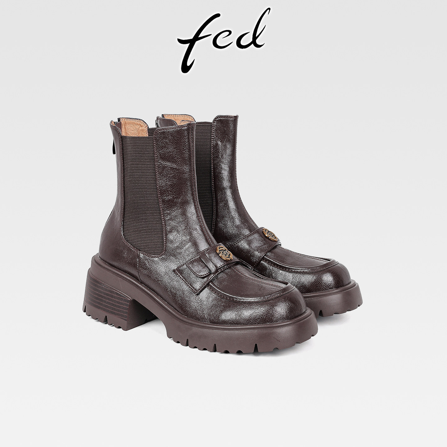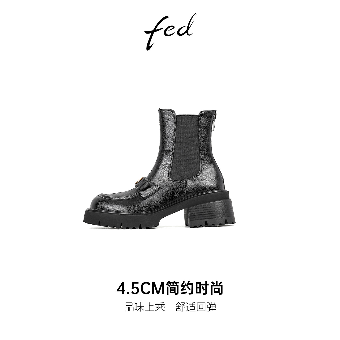 fed真皮粗跟厚底山茶花切尔西短靴女秋冬款后拉链中跟圆头马丁靴