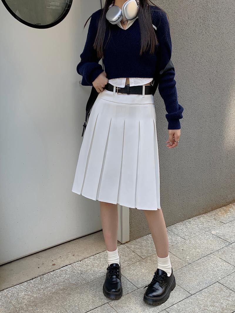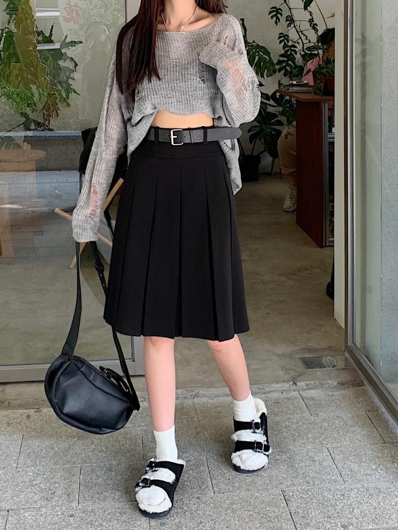 MJ STYLE灰色百褶西装裙女秋冬半身裙高腰休闲大摆a字过膝中长裙