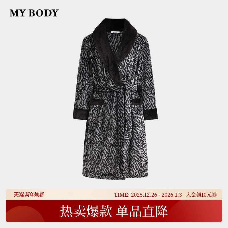 商场同款MYBODY冬季新款男士家居服时尚斑马纹开襟浴袍法兰绒睡袍