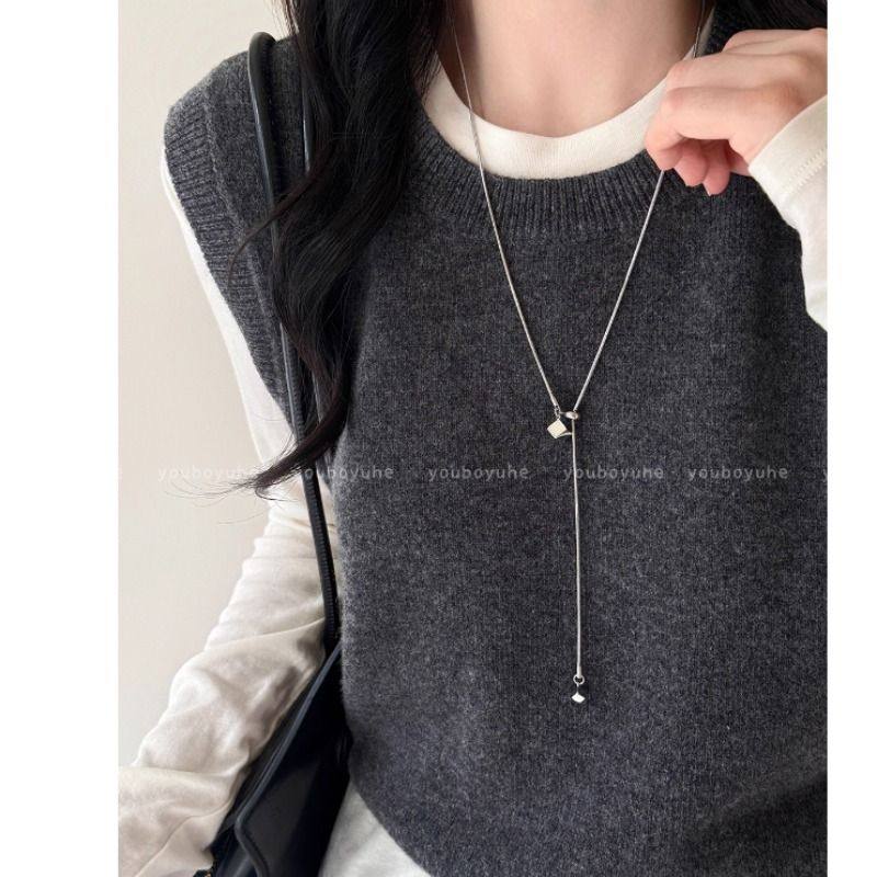 韩系银色方糖钛钢抽拉项链女独特设计秋冬长款毛衣链时尚百搭配饰