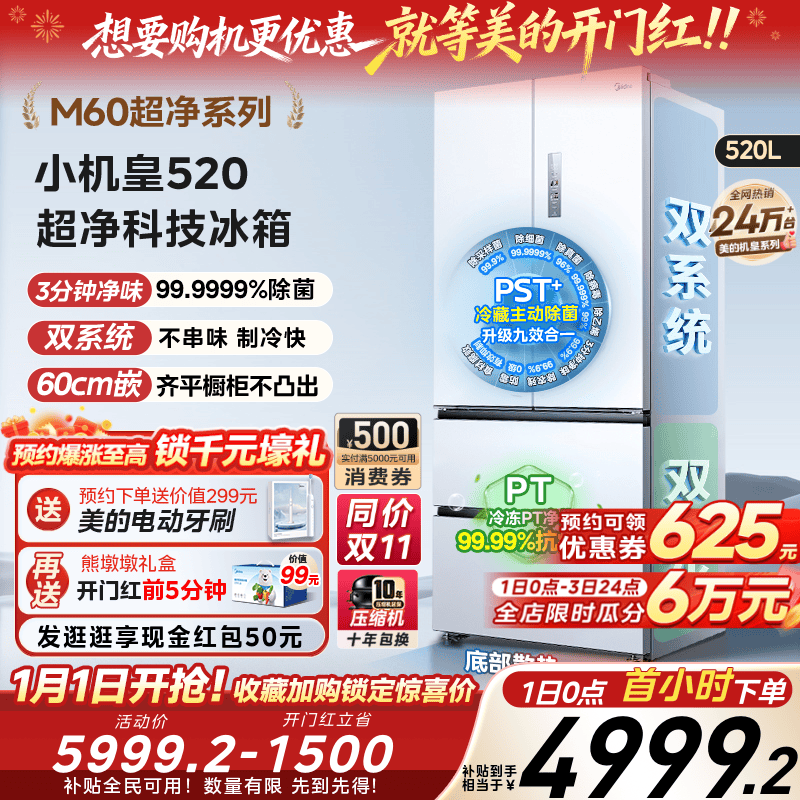 【超薄零嵌入】美的小机皇520法式多门双开四门双系统家用冰箱