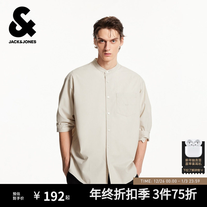 杰克琼斯男装秋季新款简约时尚潮全棉纯色圆领宽松休闲七分袖衬衫