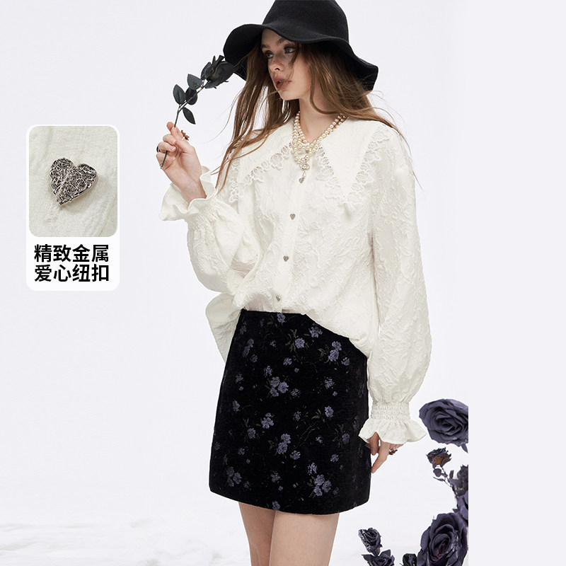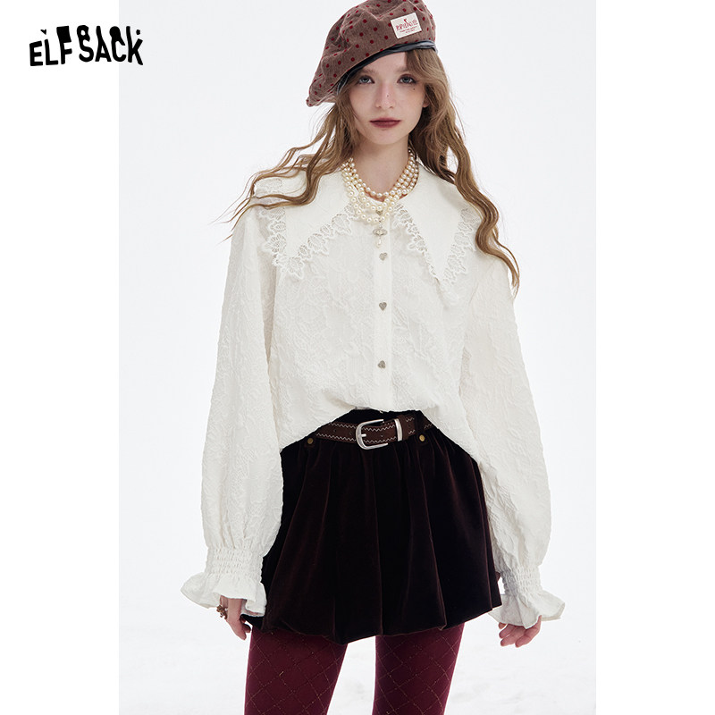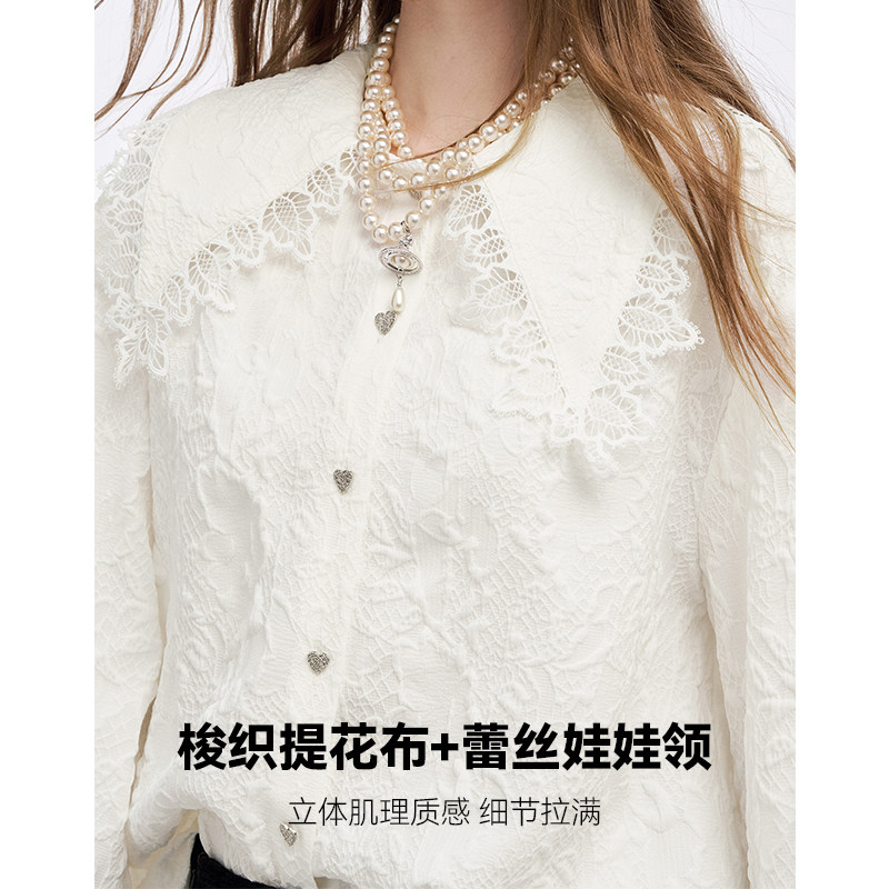 妖精的口袋娃娃领蕾丝拼接甜美衬衫女2025年冬季新款白色内搭衬衣
