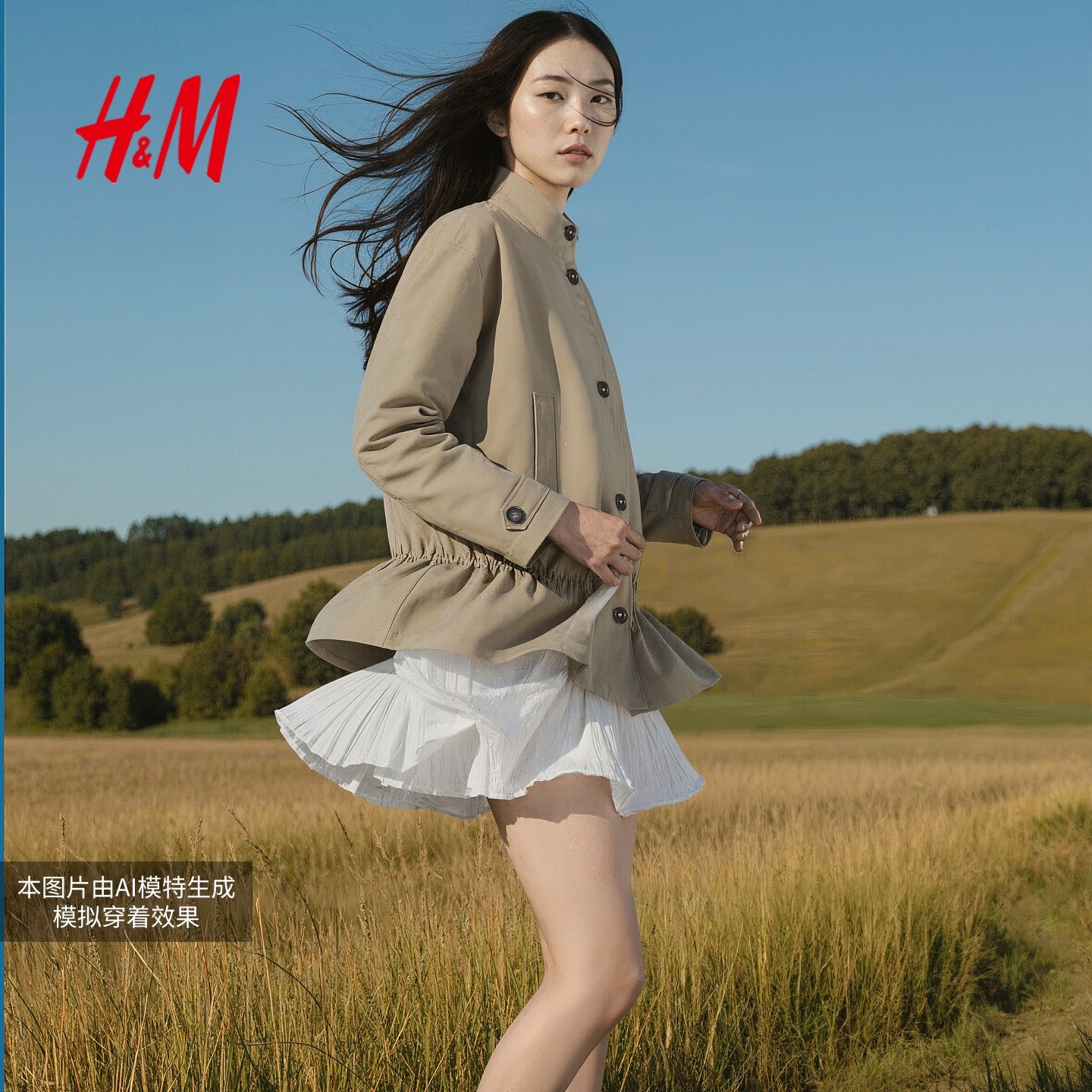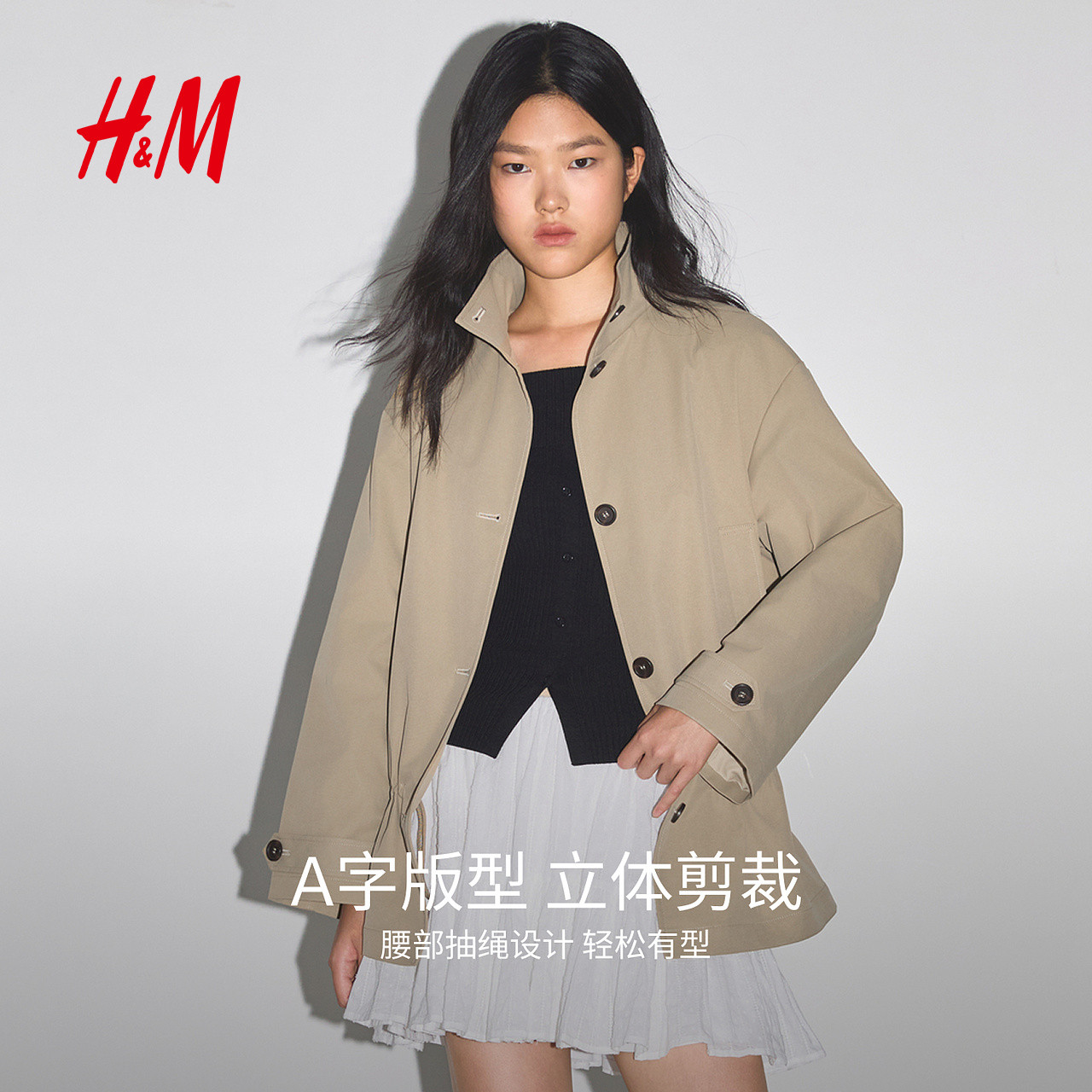 HM女装风衣冬季中长款时尚花苞抽绳型休闲大衣1000019
