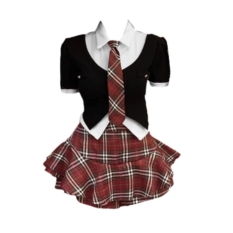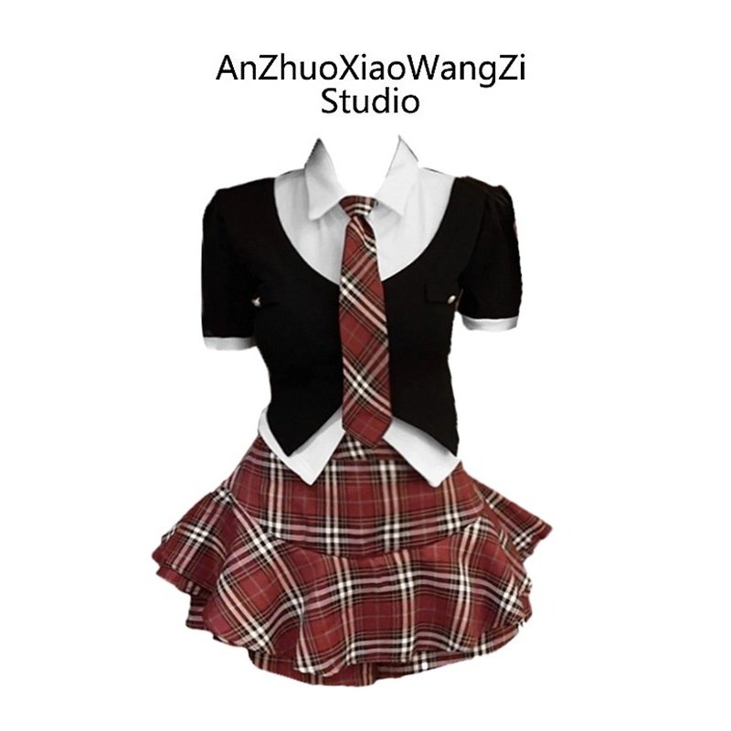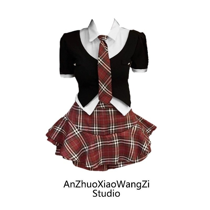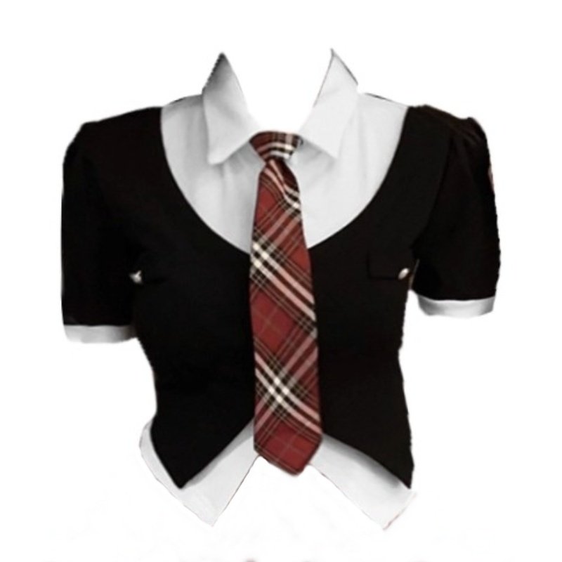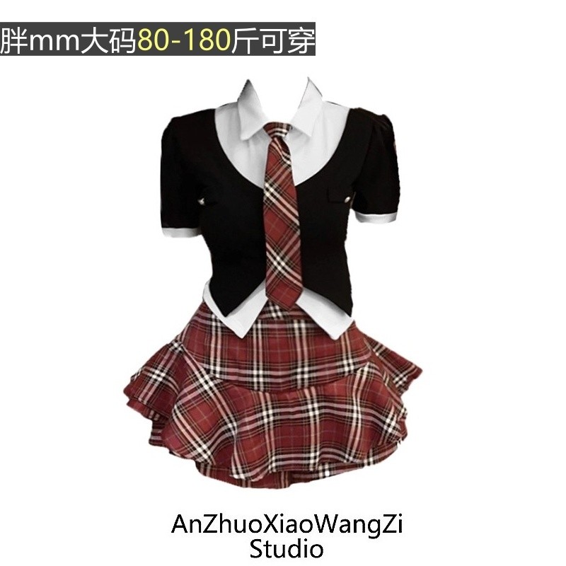 美式甜心大码学院风辣妹女夏季jk制服假两件上衣高腰半身裙两件套