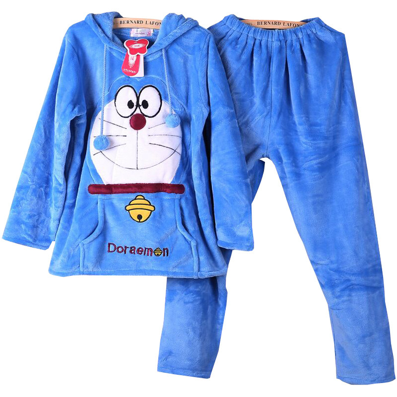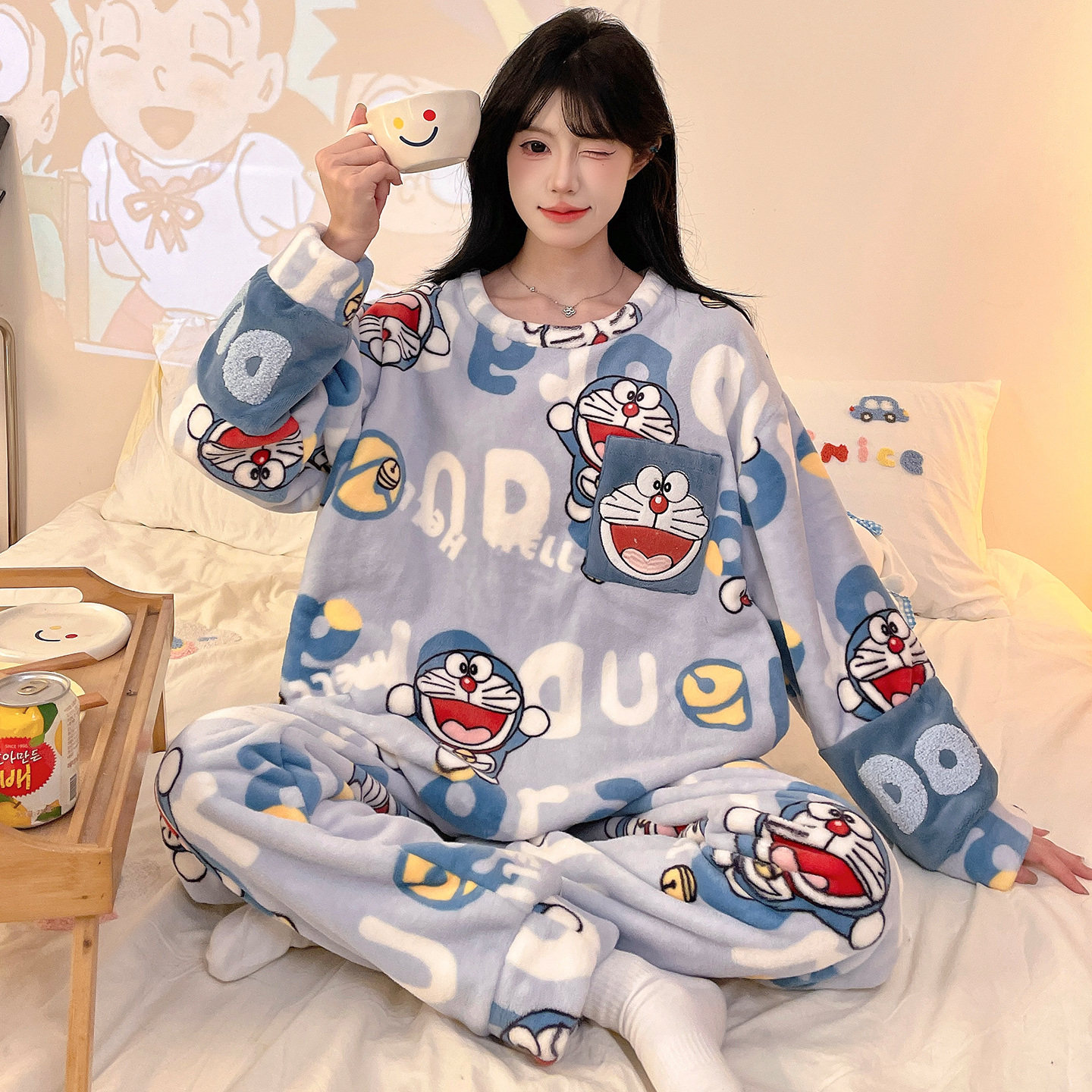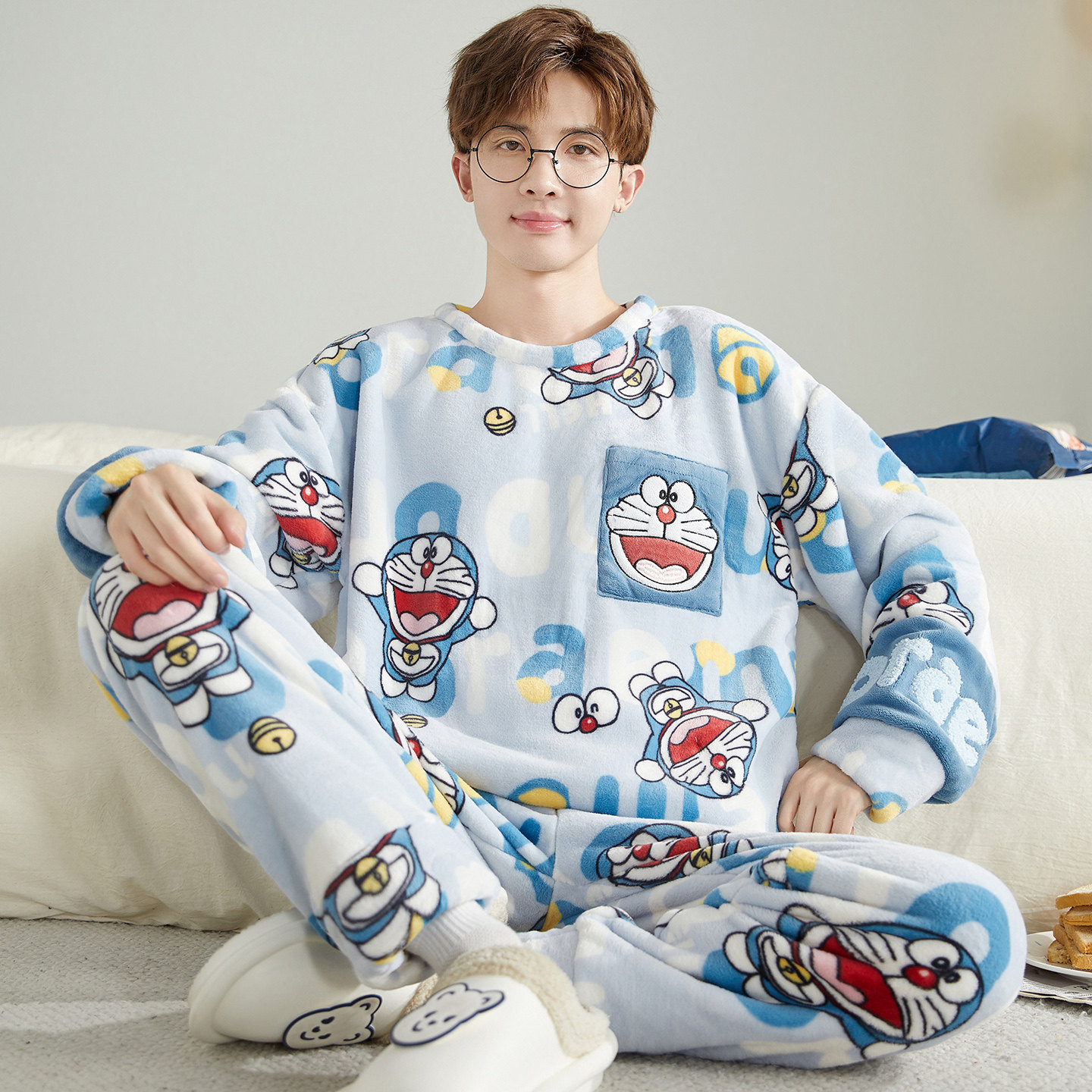 秋冬季加厚卡通珊瑚绒男士女士家居服套装哆啦A梦法兰绒情侣睡衣