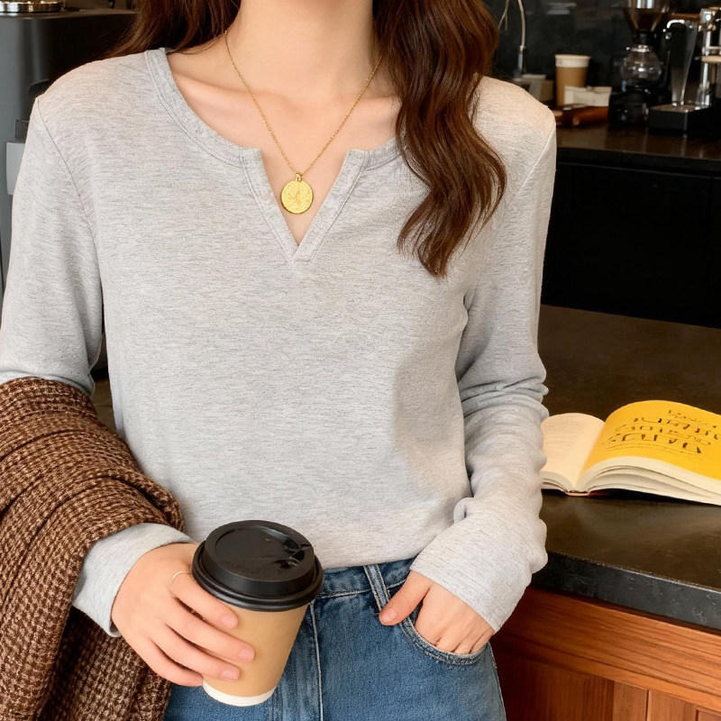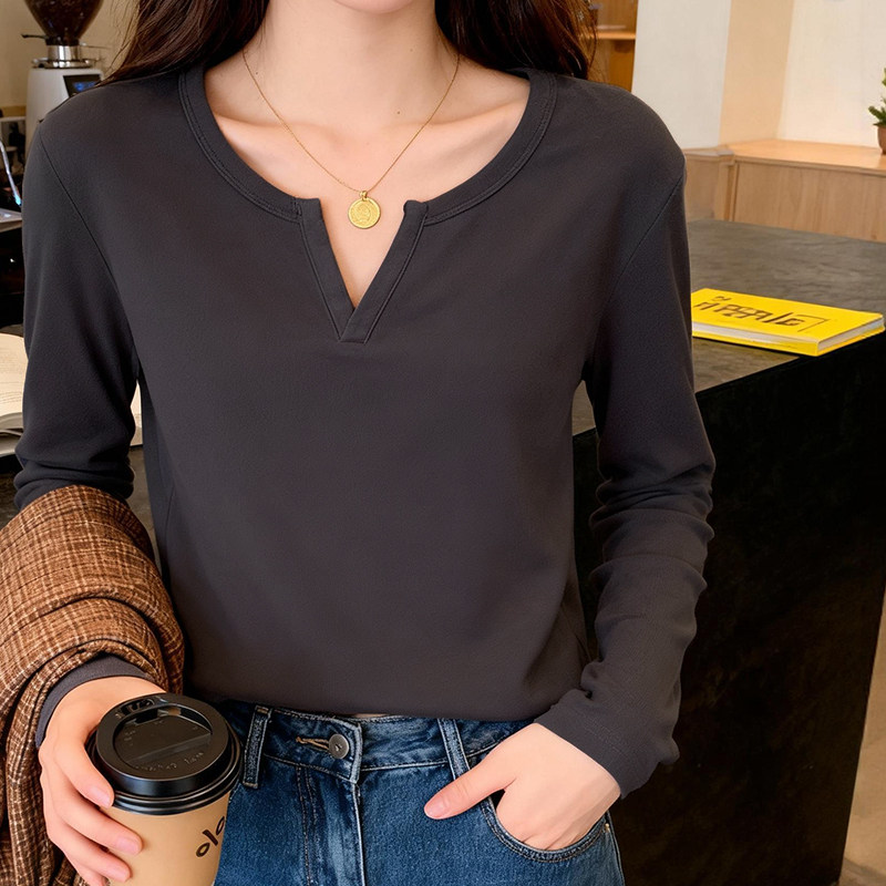 三福打底衫女2025新款秋季简约纯色收腰V领修身休闲长袖上衣女装
