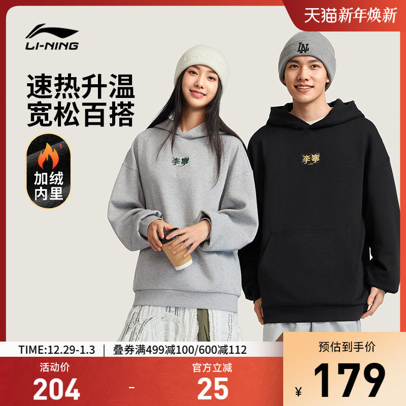 李宁加绒卫衣女冬季黑色长袖宽松保暖加厚上衣情侣装帽衫运动服男