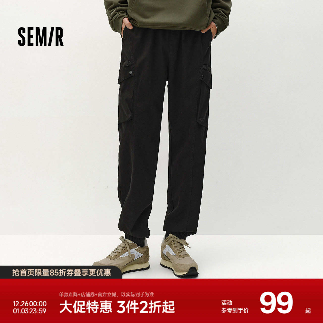 森马休闲裤男冬季磨毛大口袋工装裤户外运动宽松束脚裤松紧腰长裤