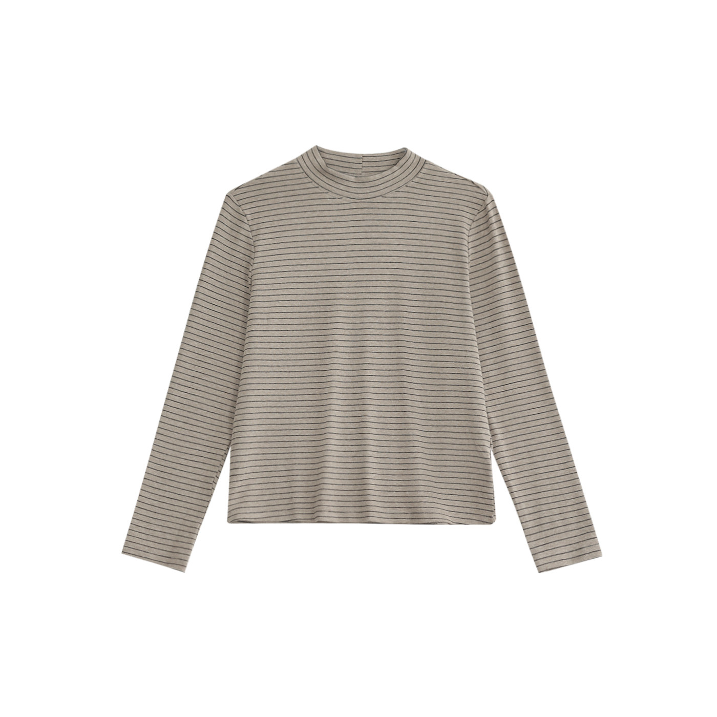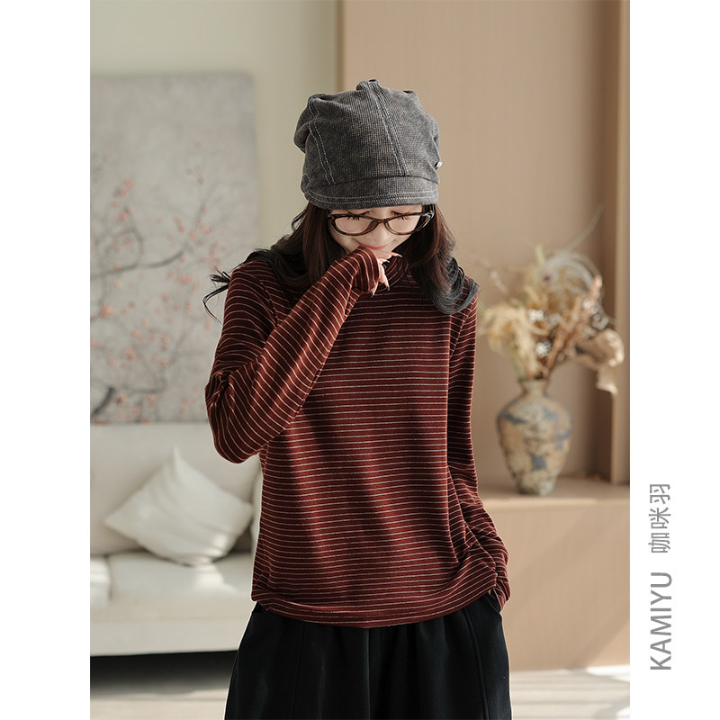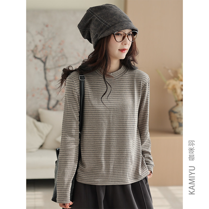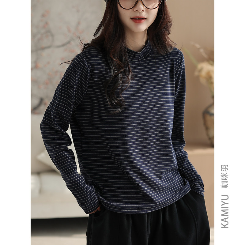 咖咪羽简约圆领条纹T恤时尚半高领减龄长袖百搭打底衫上衣女