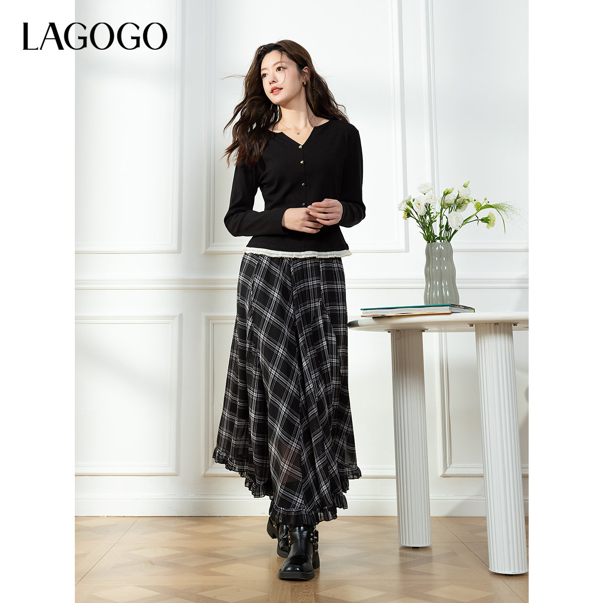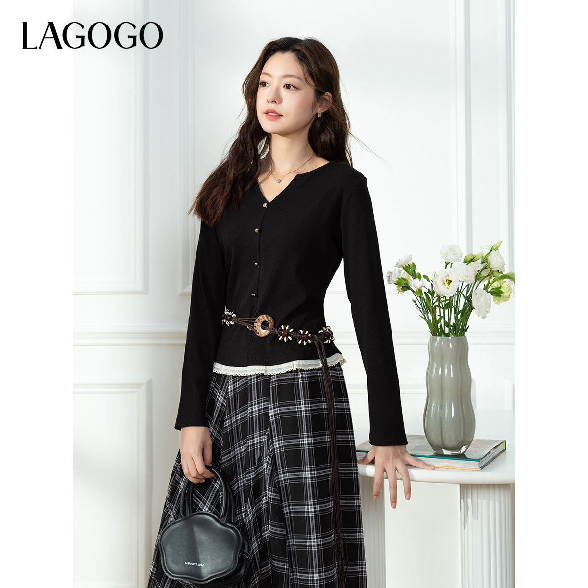 LAGOGO花边下摆黑色T恤女拉谷谷2026春新款内搭打底长袖上衣