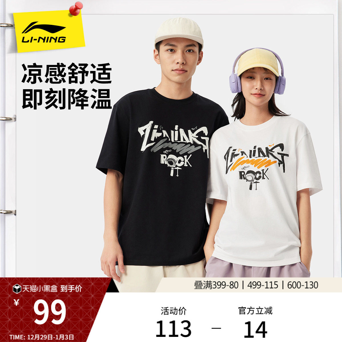 李宁短袖男夏季官方新款圆领半袖情侣休闲印花上衣针织运动T恤女