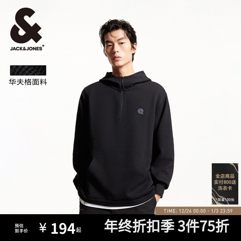 杰克琼斯男装2025年秋季宽松华夫格面料卫衣刺绣贴布拉链连帽情侣