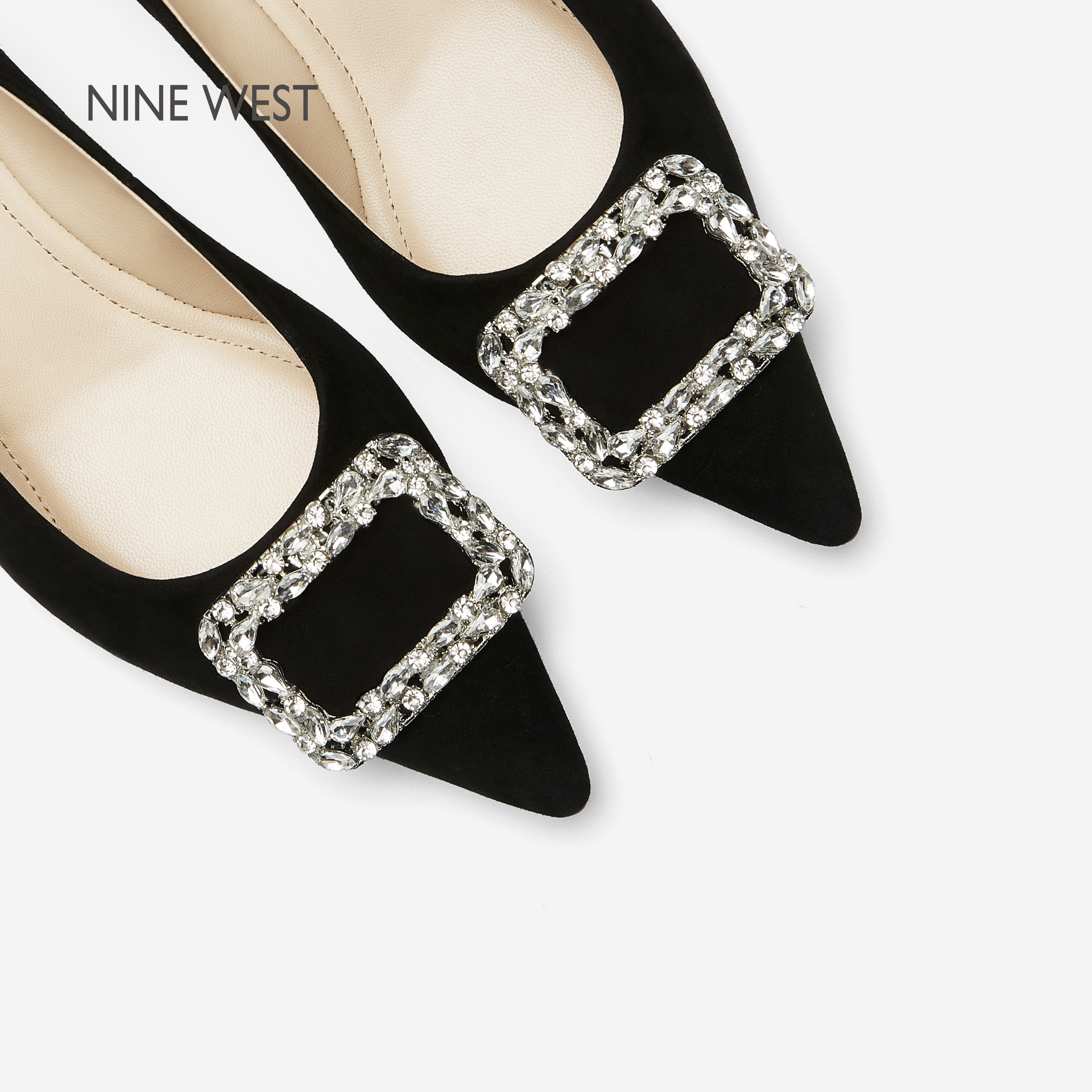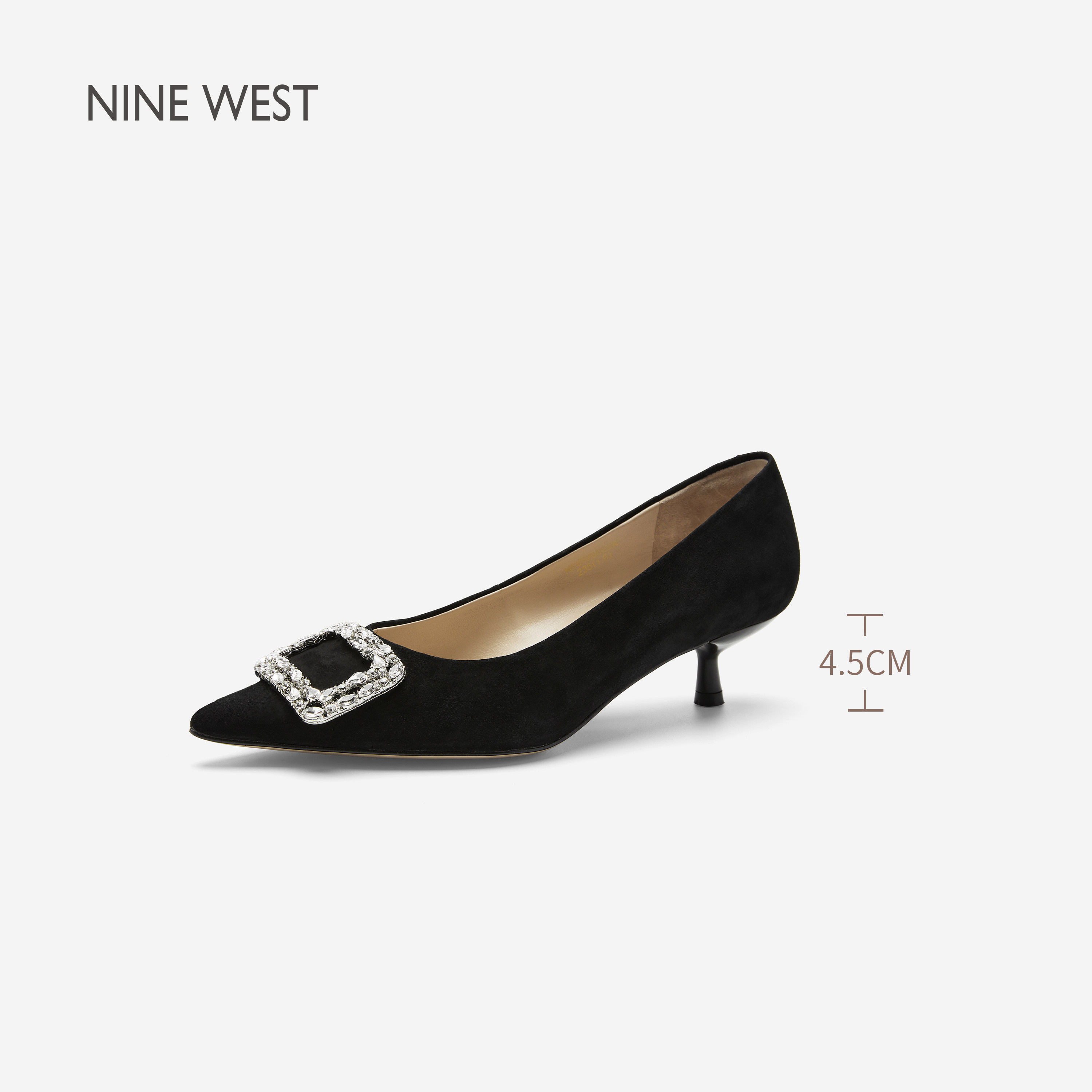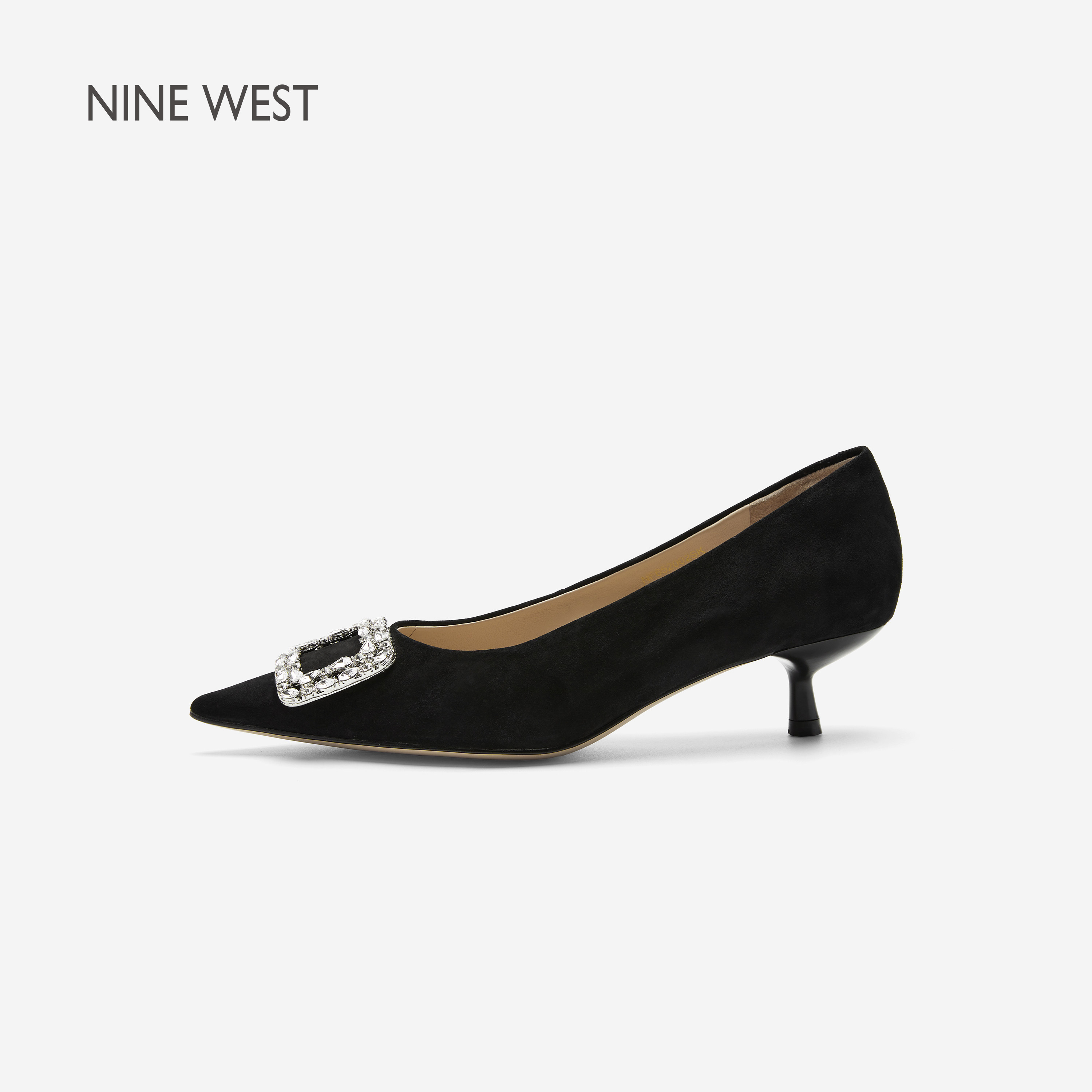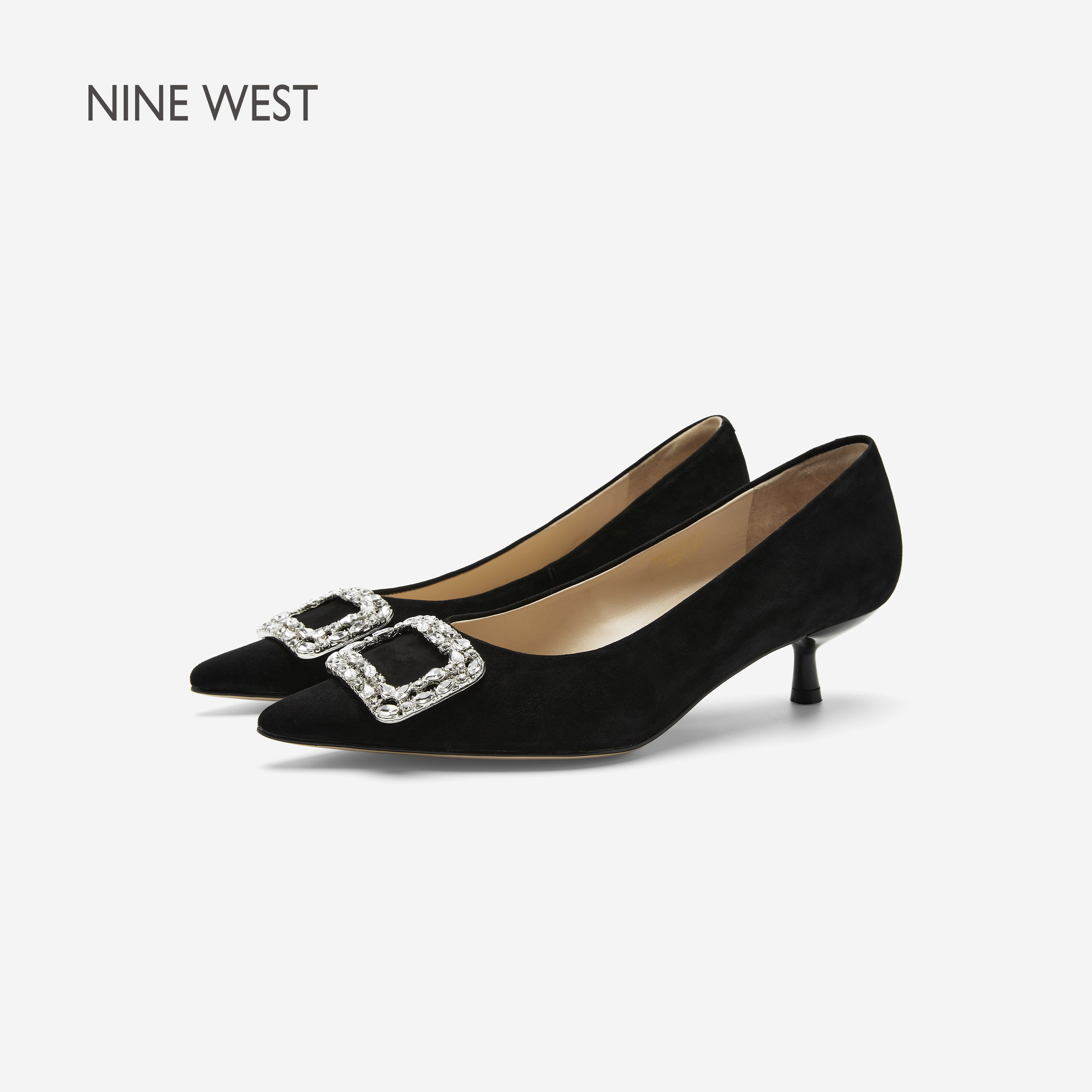 Nine West/玖熙星芒梦境水钻方扣尖头单鞋女真皮小猫跟浅口高跟鞋