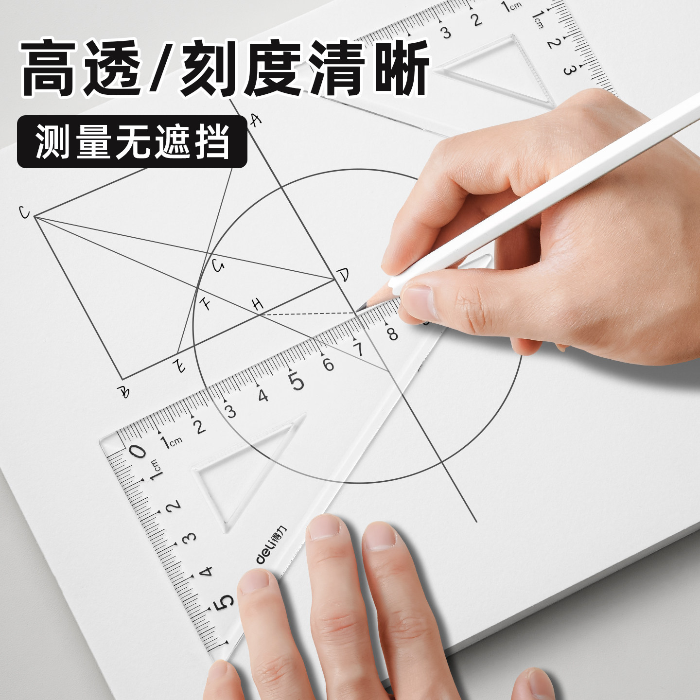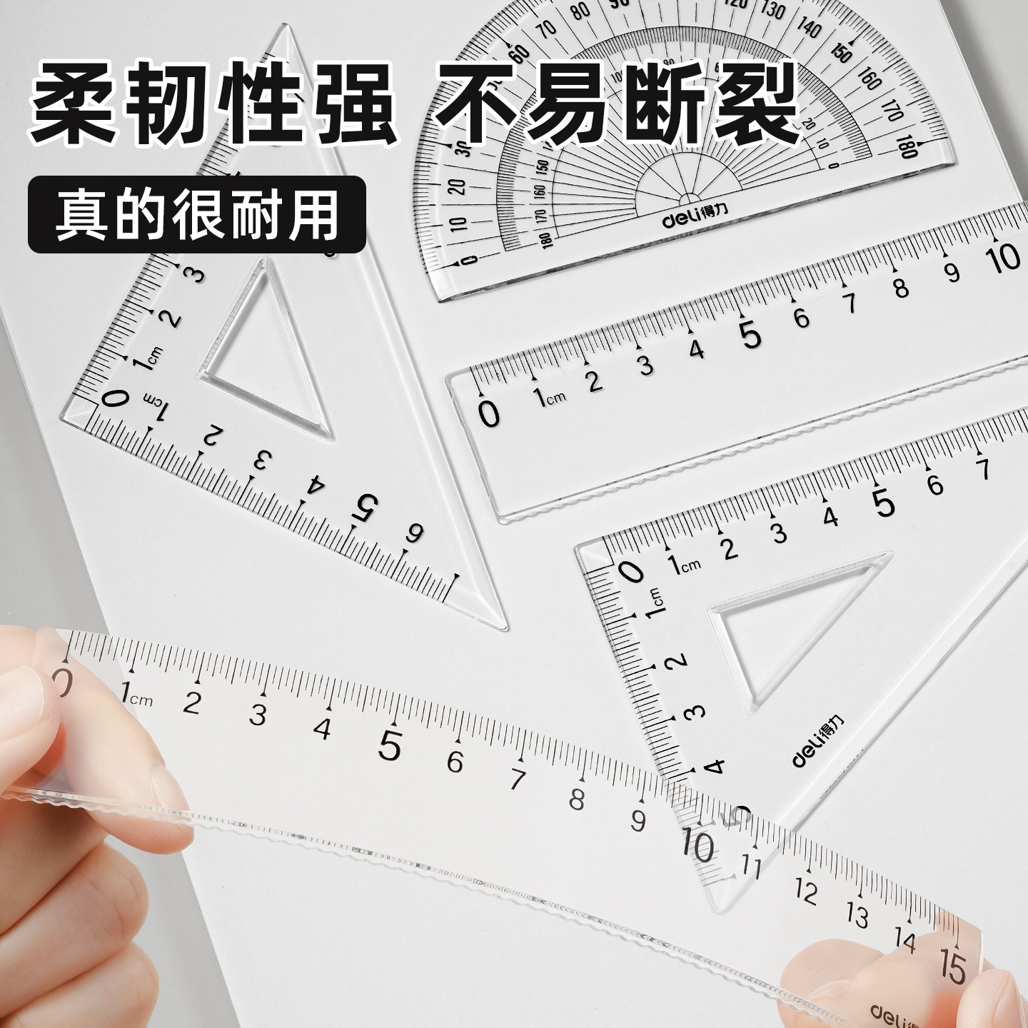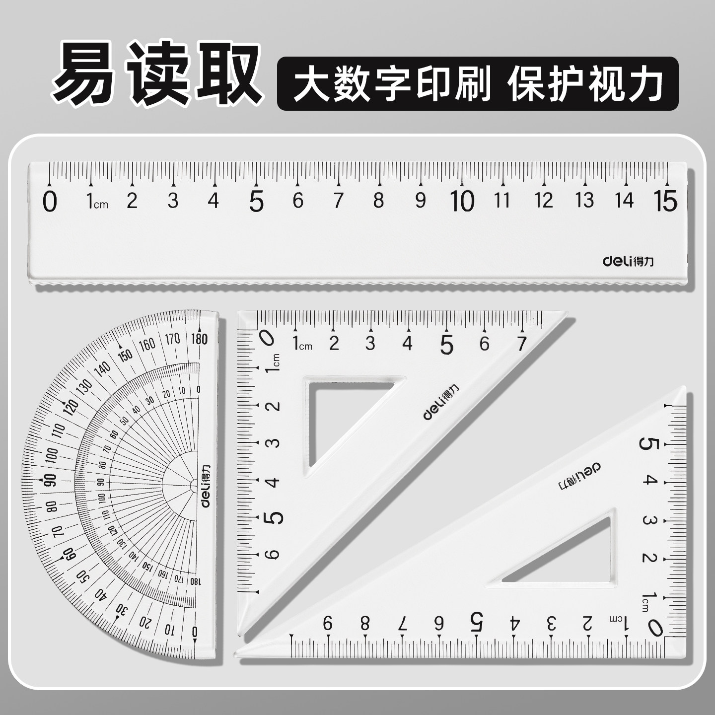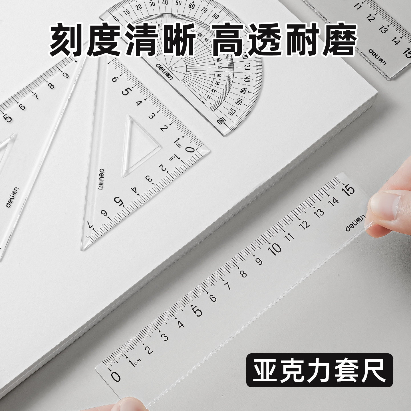 得力文具学生套尺尺子四件套三角尺直尺量角器套装透明亚克力材质多规格套装小学生专用初中生文具多功能绘图