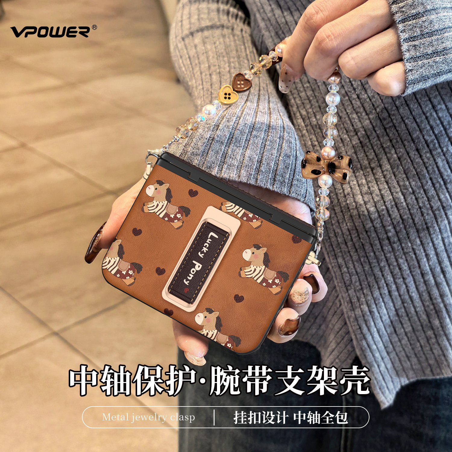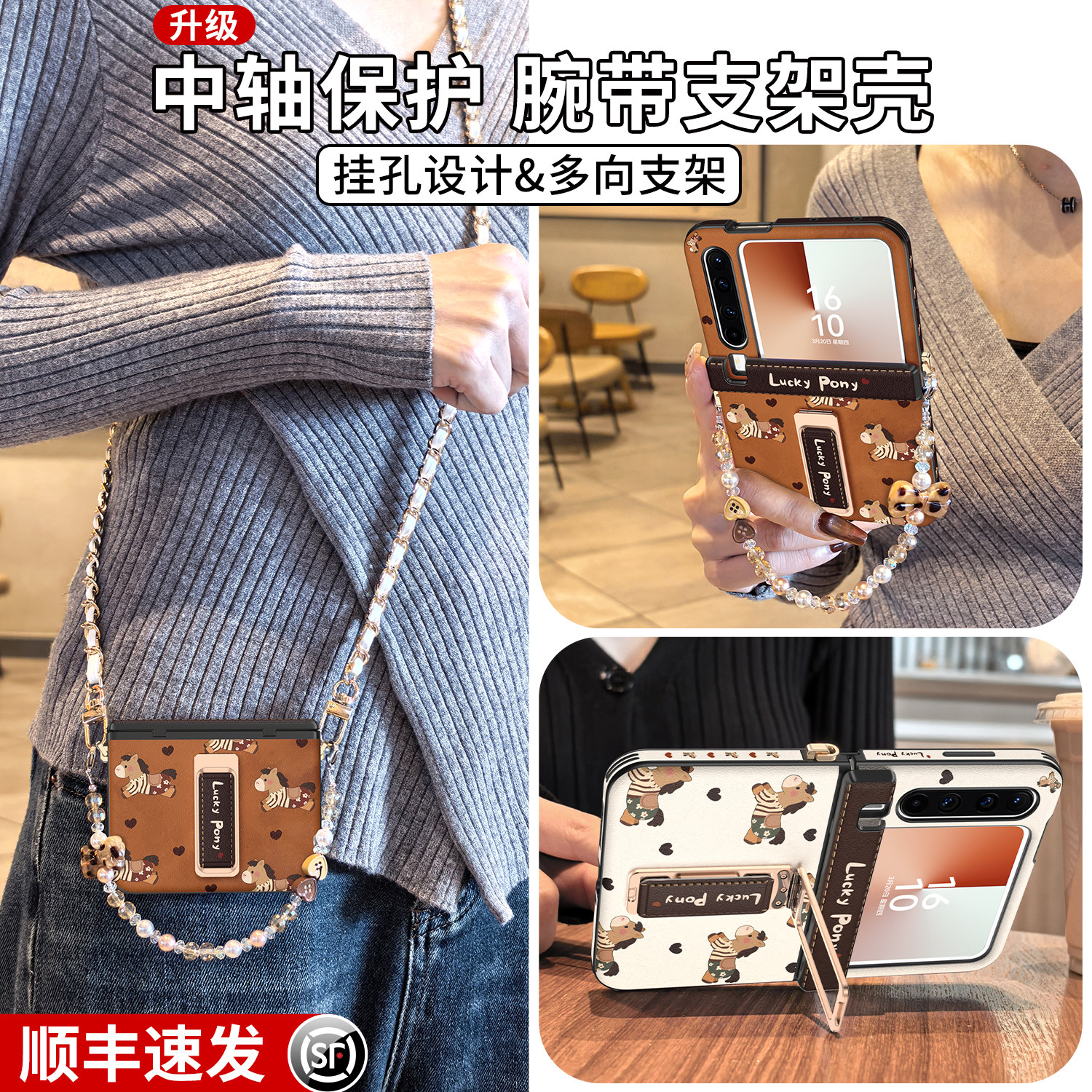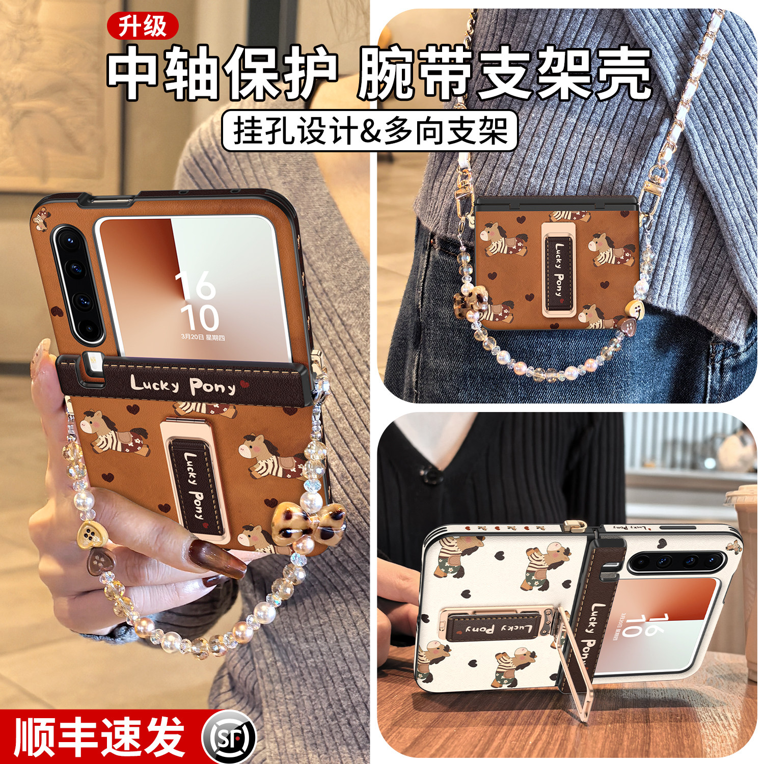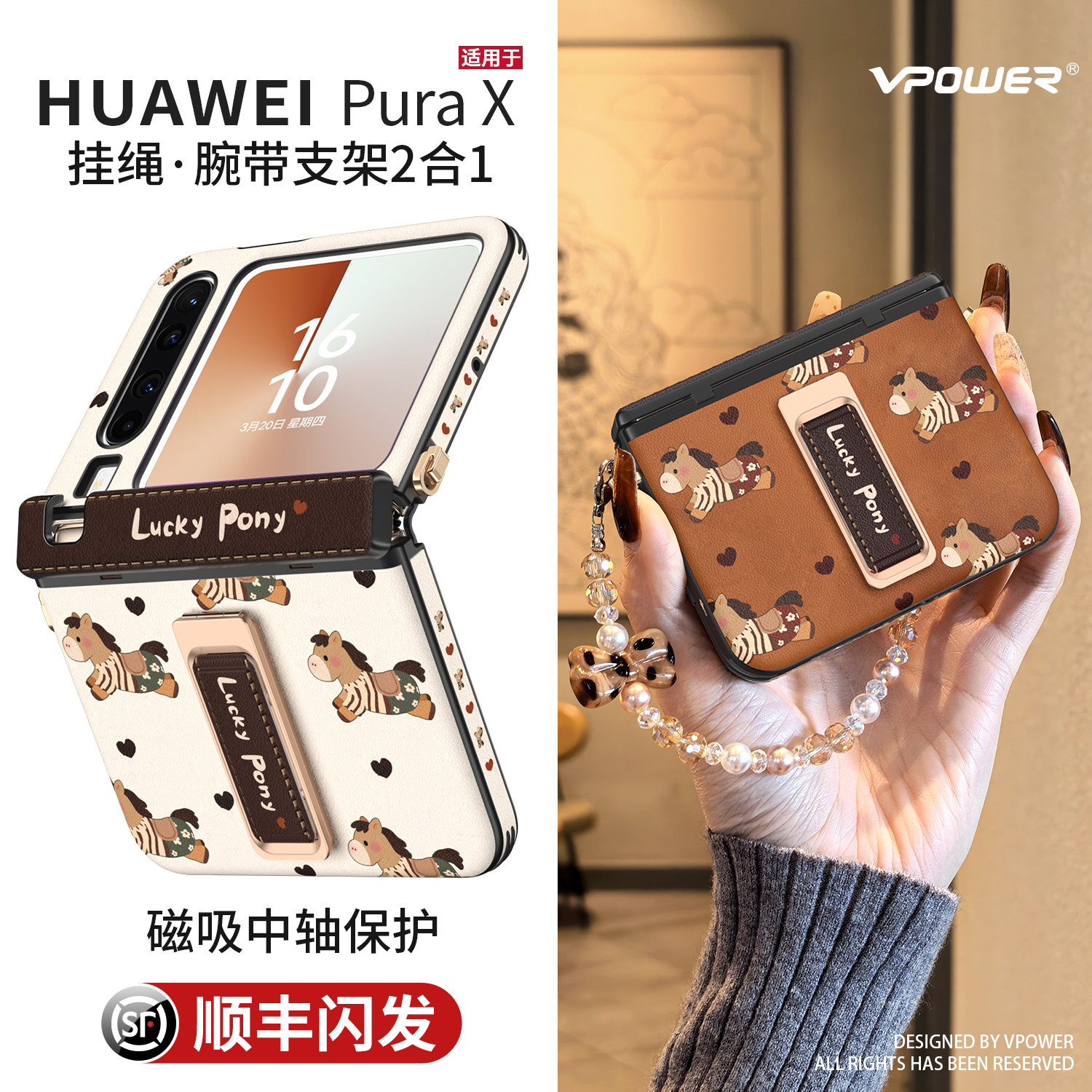 复古小马棕适用华为purax手机壳新款腕带支架pura典藏版x折叠屏铰链全包高档皮纹卡通马年带挂绳斜挎保护套