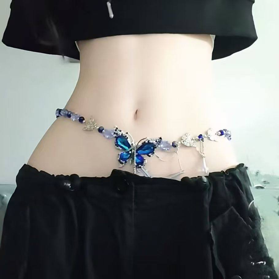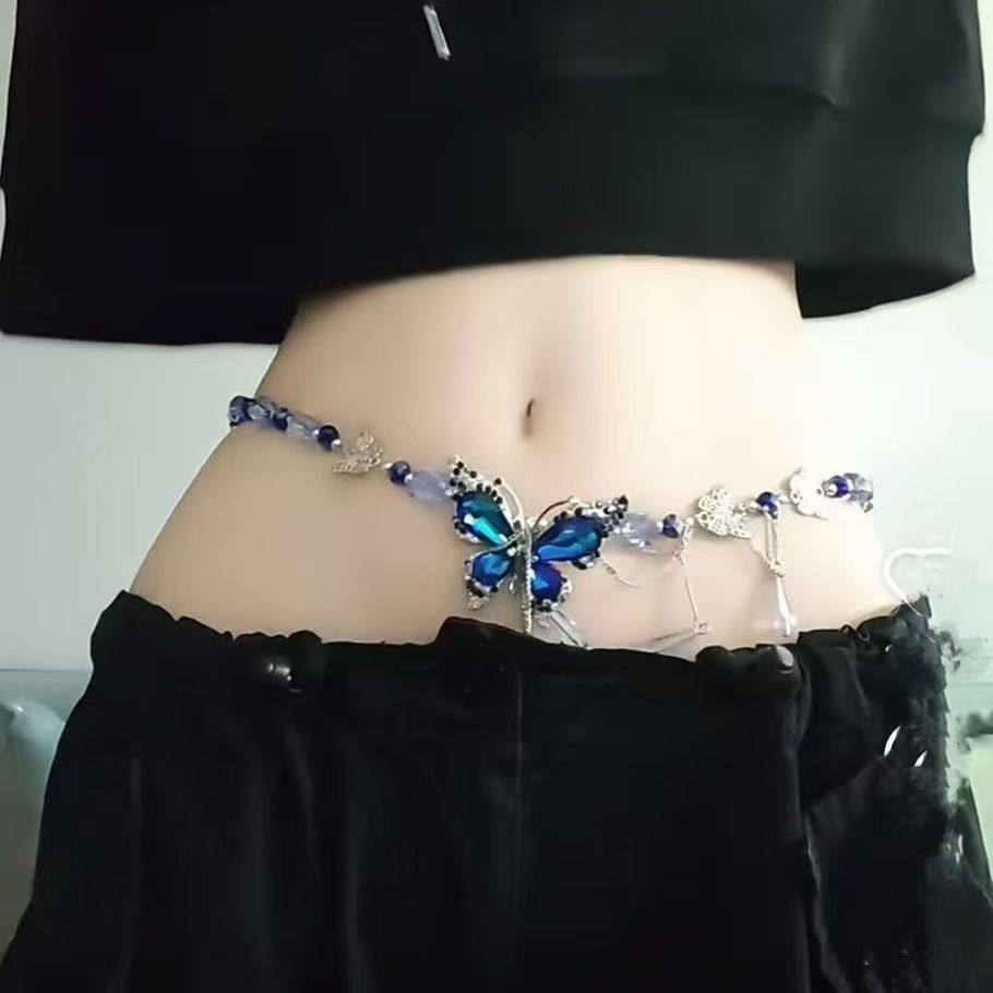 蝴蝶流苏镶钻2025新款重工复古蓝色流苏锁骨链choker腰链