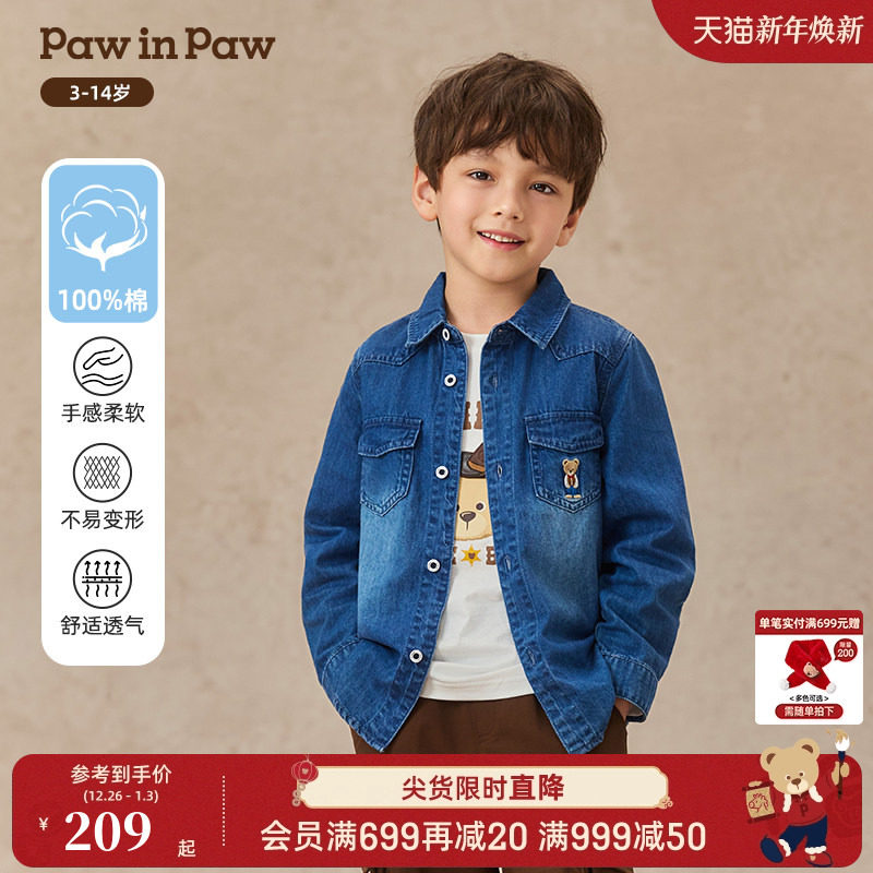 PawinPaw卡通小熊童装25年秋季新款男童长袖牛仔衬衫纯棉外套全棉
