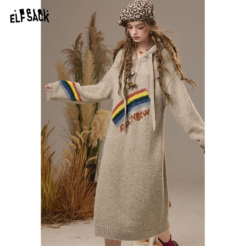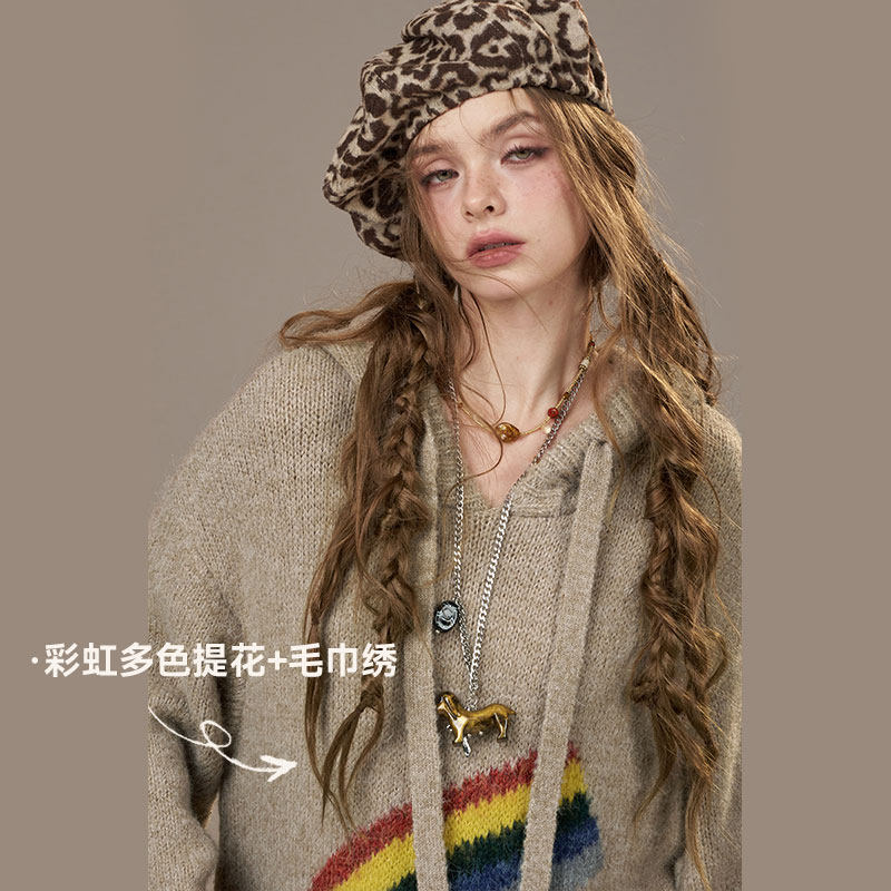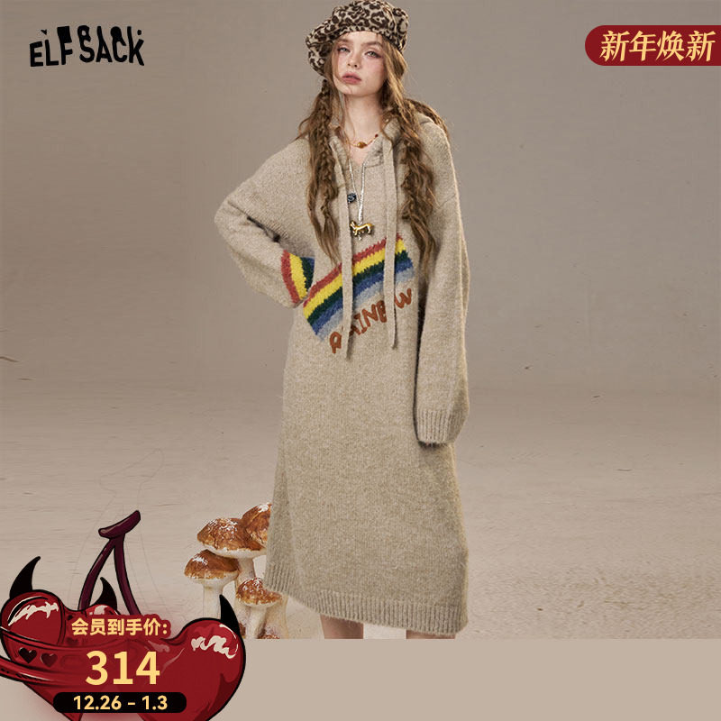 妖精的口袋彩虹提花连帽针织连衣裙女2025年秋冬新款甜美新年穿搭