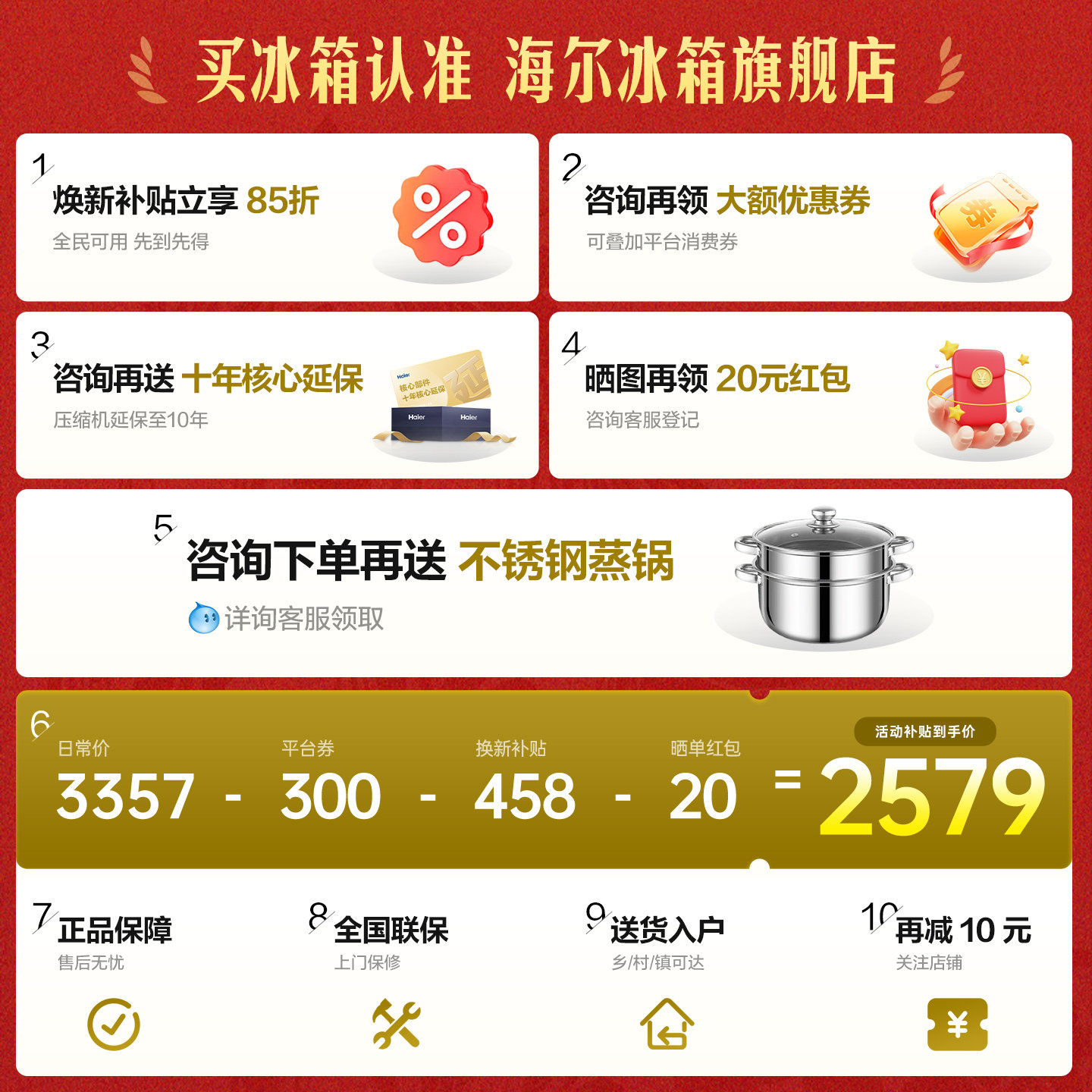海尔冰箱以旧换新补贴476L十字双开门大容量家用一级能效无霜官方