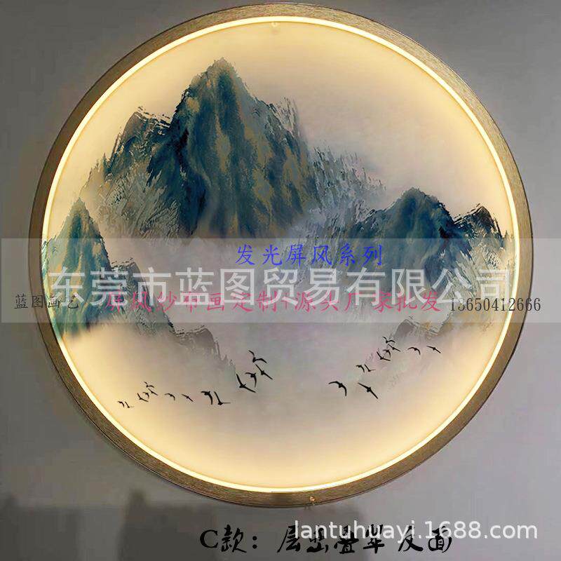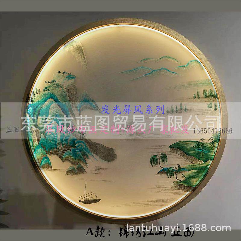 新中式圆形半透明纱布装饰画发光电池挂画玄关屏风隔断软装设计