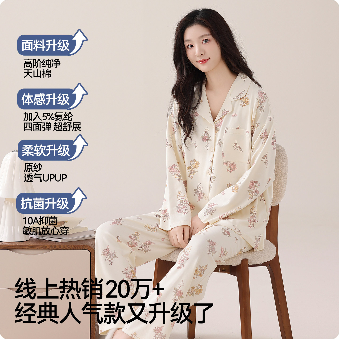 浪莎睡衣女款春秋季2025新款抗菌纯棉布料100%全棉长袖家居服套装