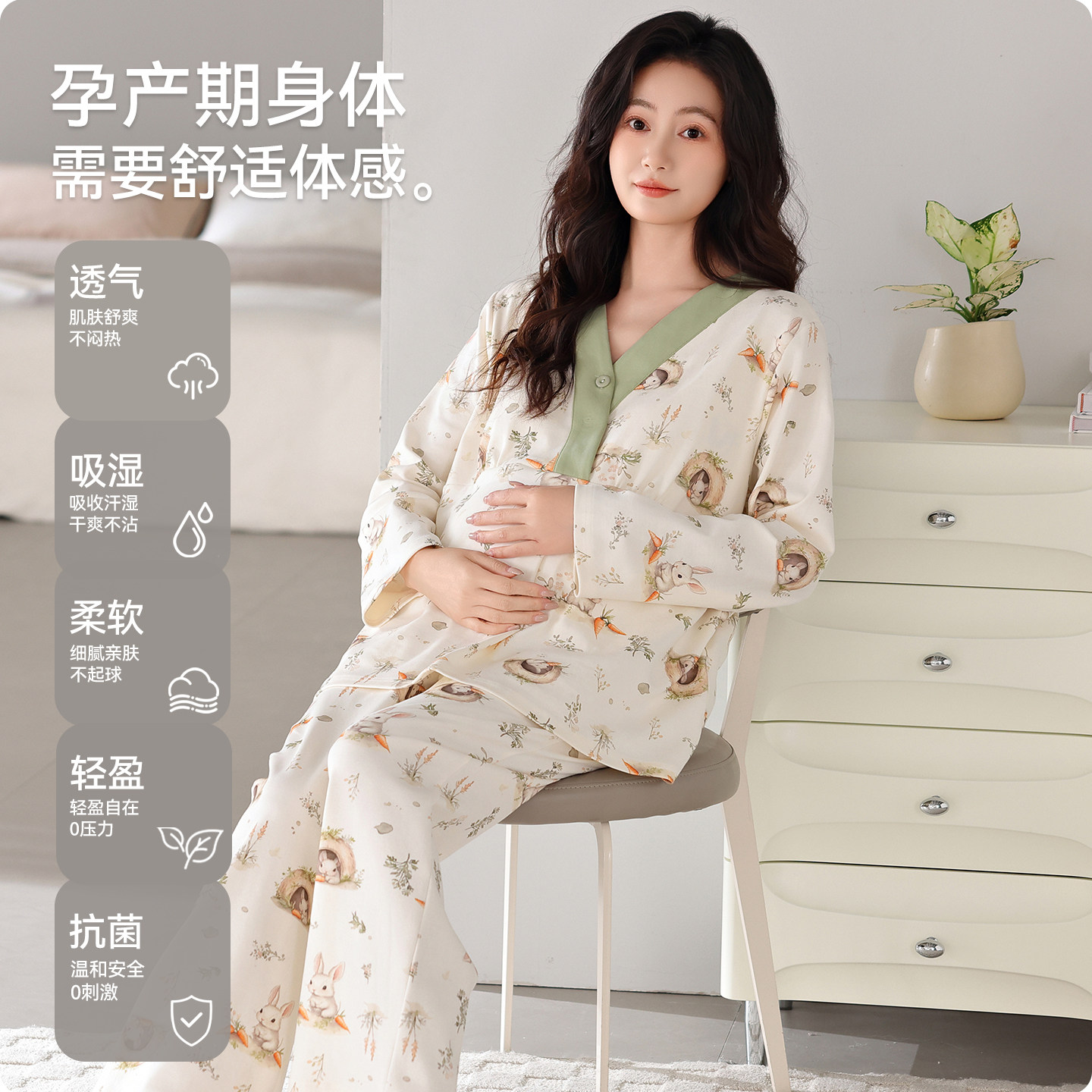 都市丽人月子服纯棉春秋季带胸垫产后哺乳睡衣孕期全棉吸汗家居服
