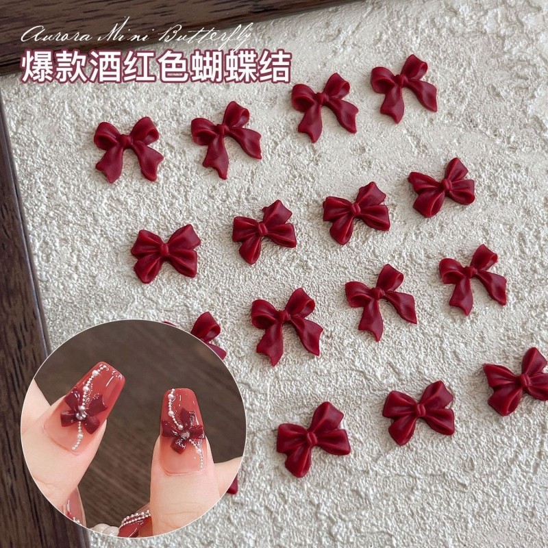 爆款酒红色蝴蝶结美甲饰品甜酷风领结平底磨砂款穿戴甲小装饰