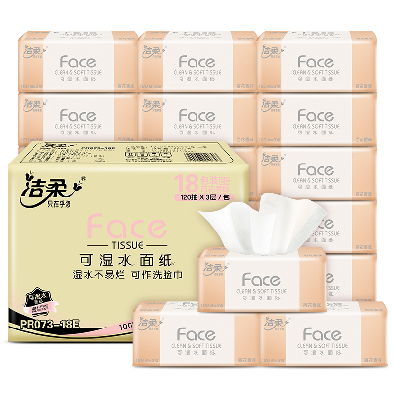 洁柔抽纸120抽3层百花香27包可湿水面巾纸家用纸巾香味原生木浆