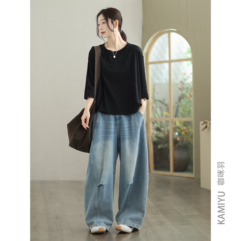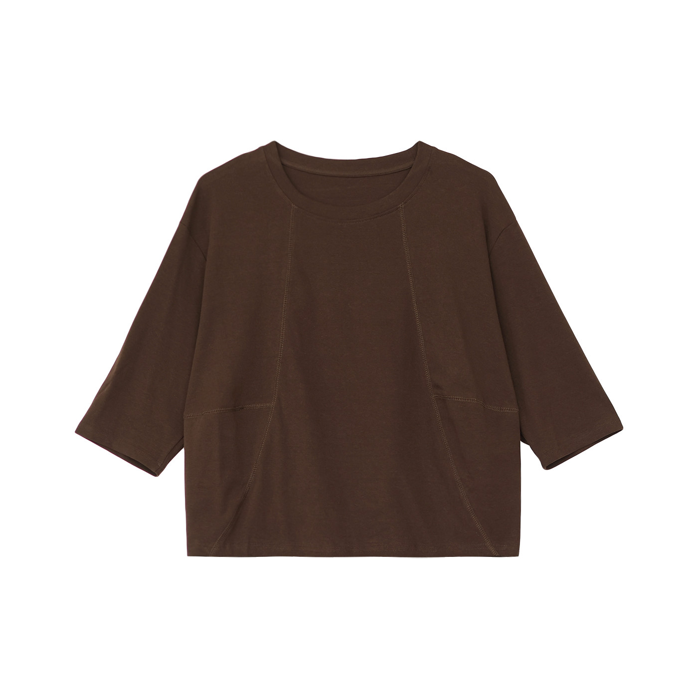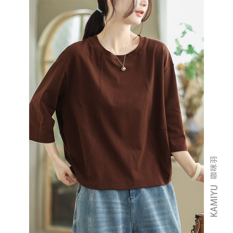 咖咪羽韩版文艺简约纯色拼接圆领七分袖设计感宽松大码全棉T恤女