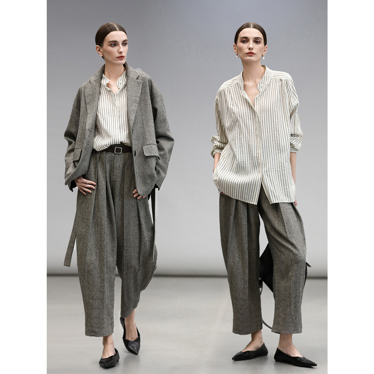COCOBELLA设计感捏褶小立领条纹衬衫早秋宽松仿棉麻衬衣SR0019-2