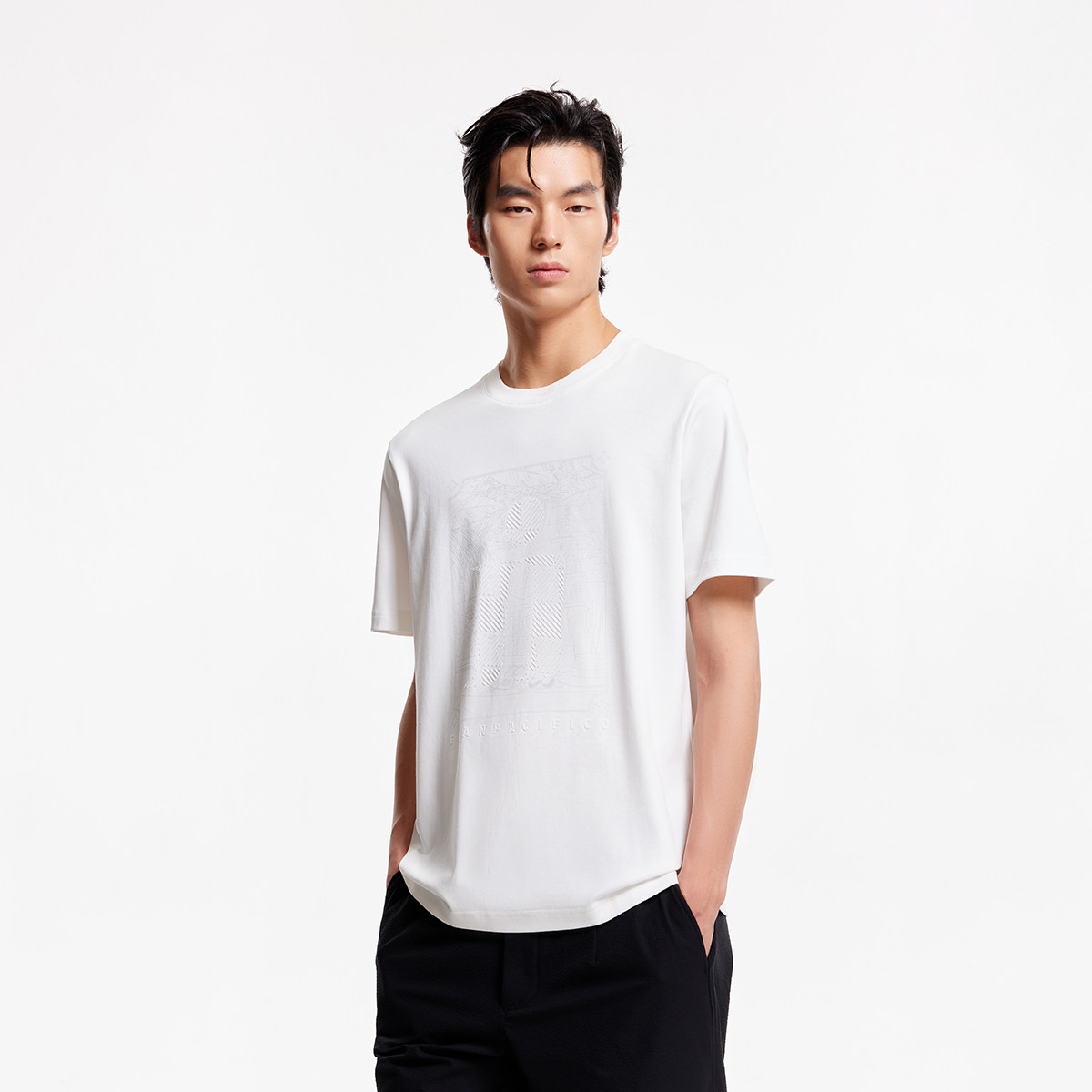 常规版型,罗纹圆领,胸前LOGO植绒印花