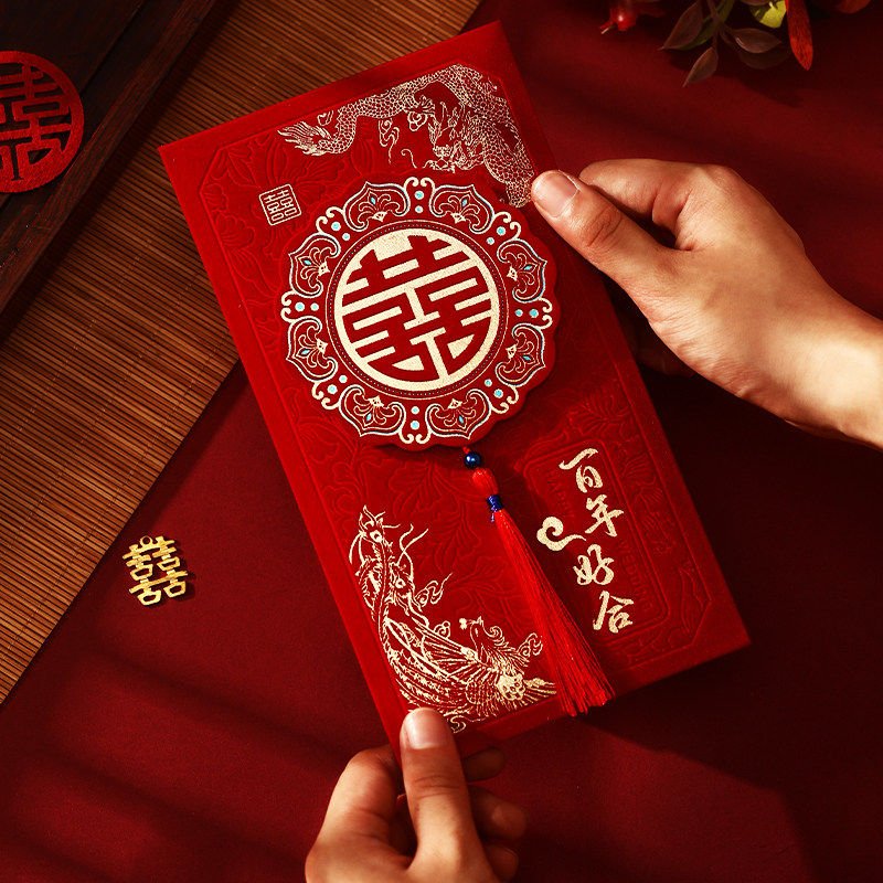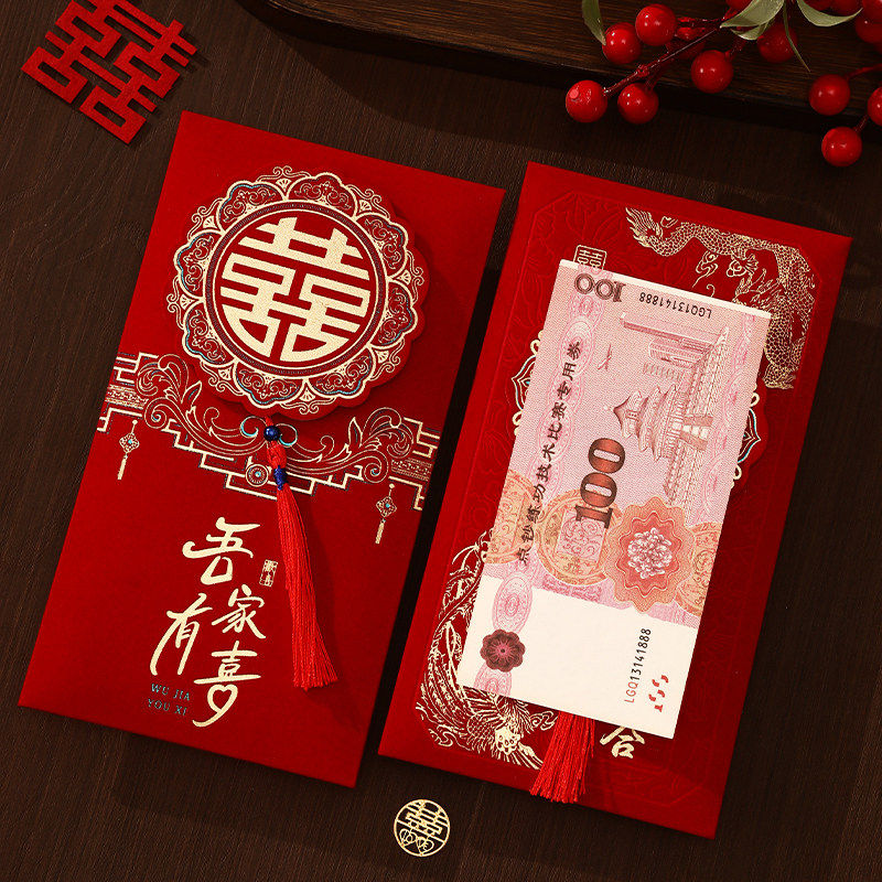 高档植绒红包2026新款订婚流苏喜字万元红包袋大号利是封立体婚礼