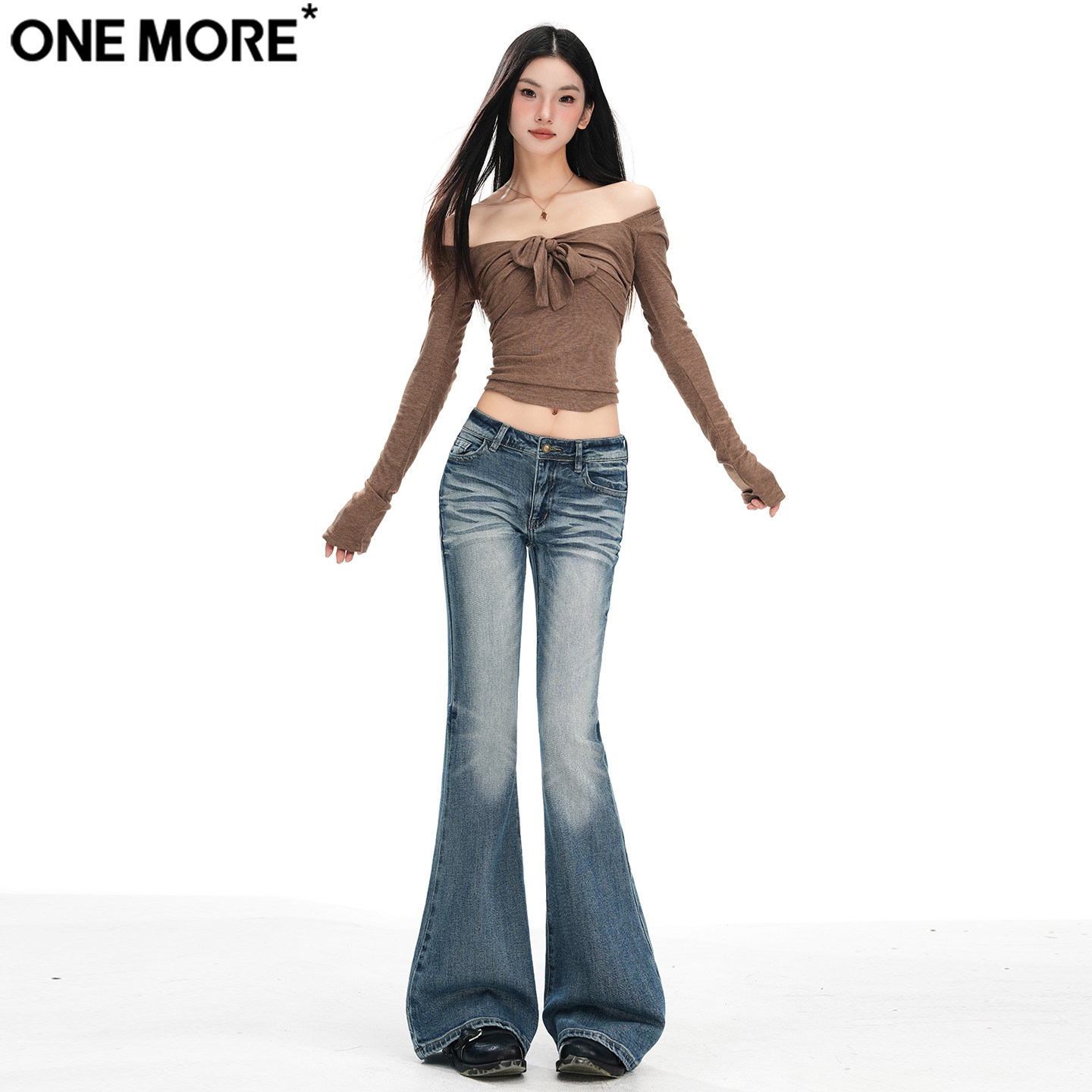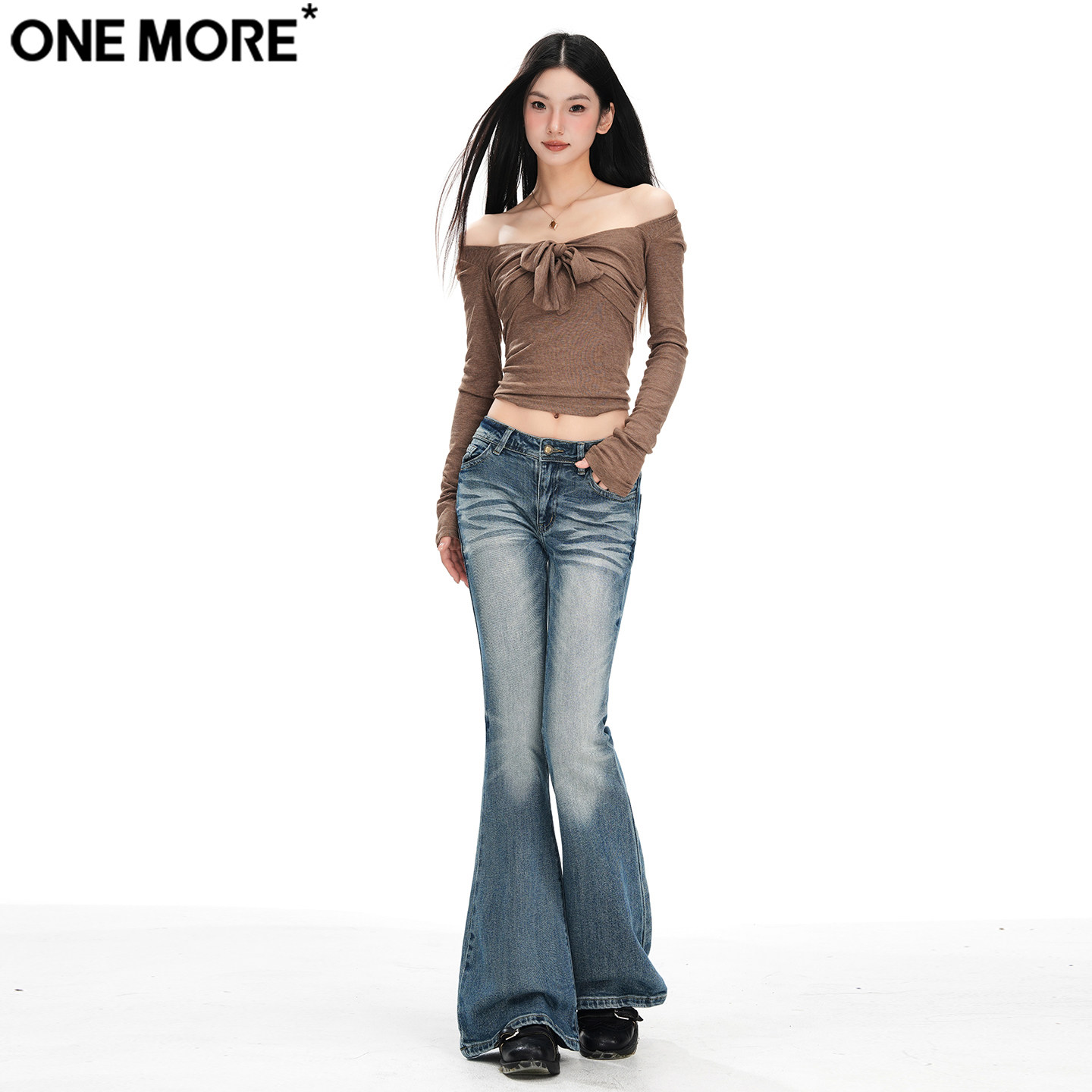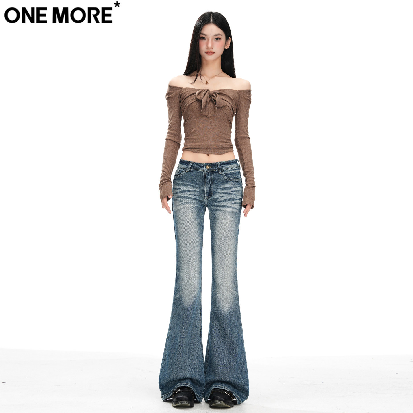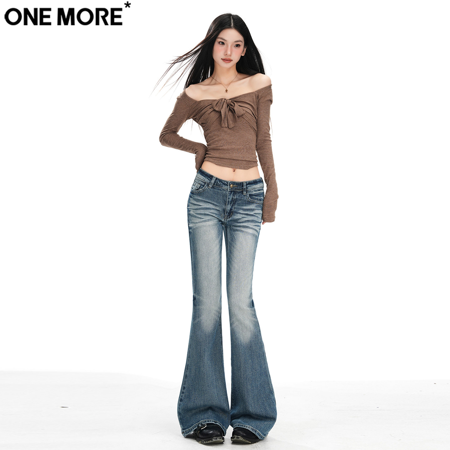 One More美式辣妹低腰微喇牛仔裤女秋冬季新款弹力显瘦紧身喇叭裤