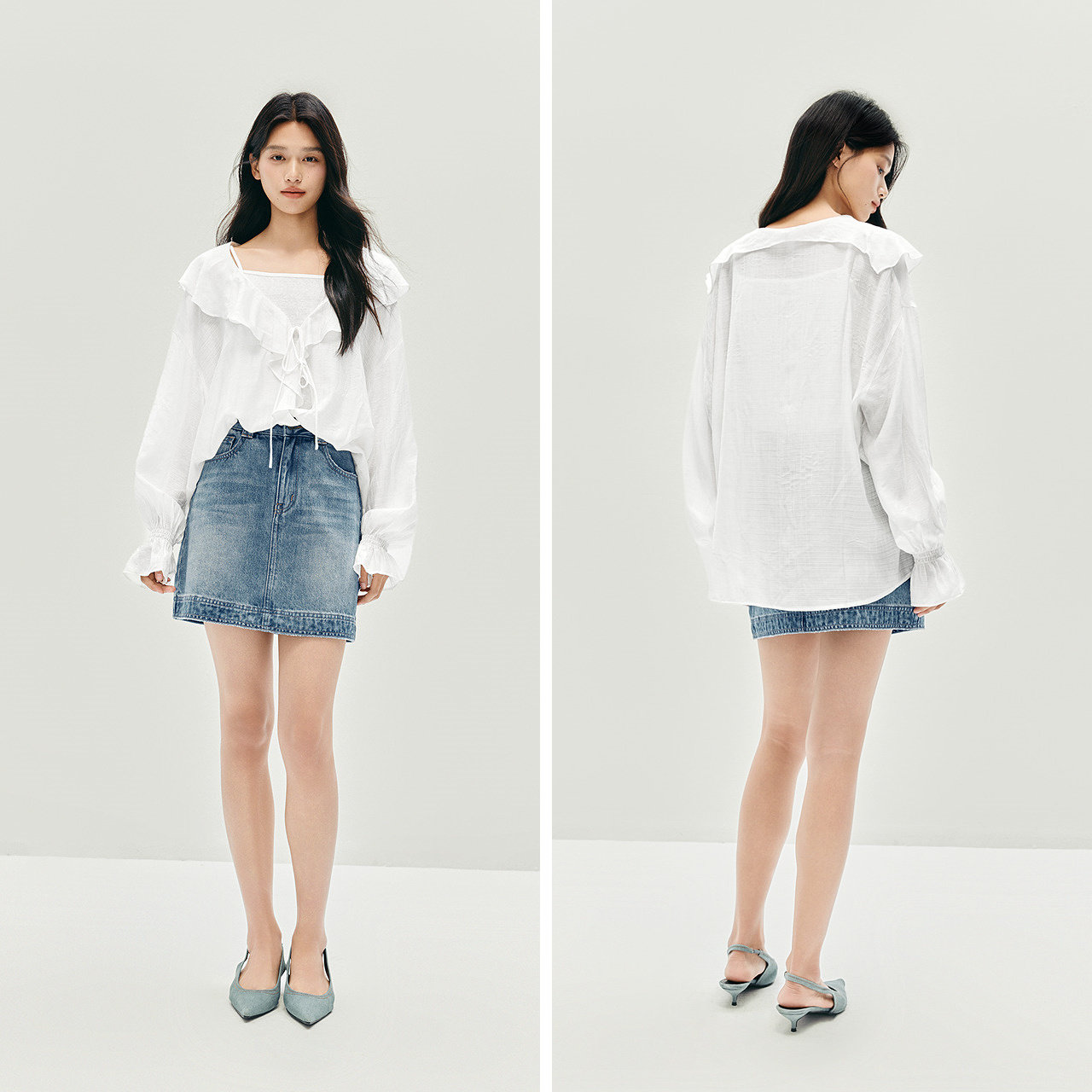 森马长袖衬衫女短吊带荷叶边宽松肌理衬衣2025秋季新款白色两件套