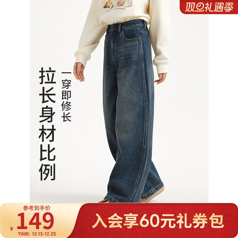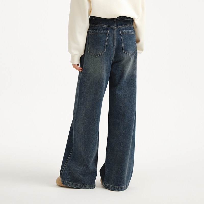 艾恩晟 2025早春美式宽松垂感牛仔阔腿裤深蓝色系慵懒风ins博主风