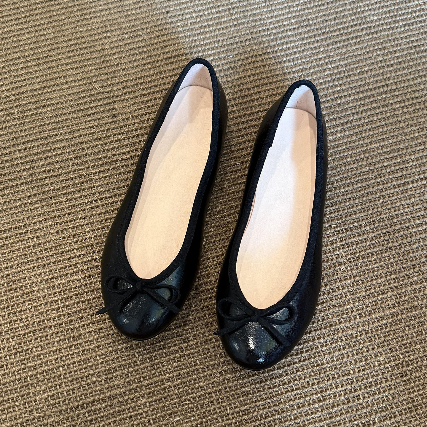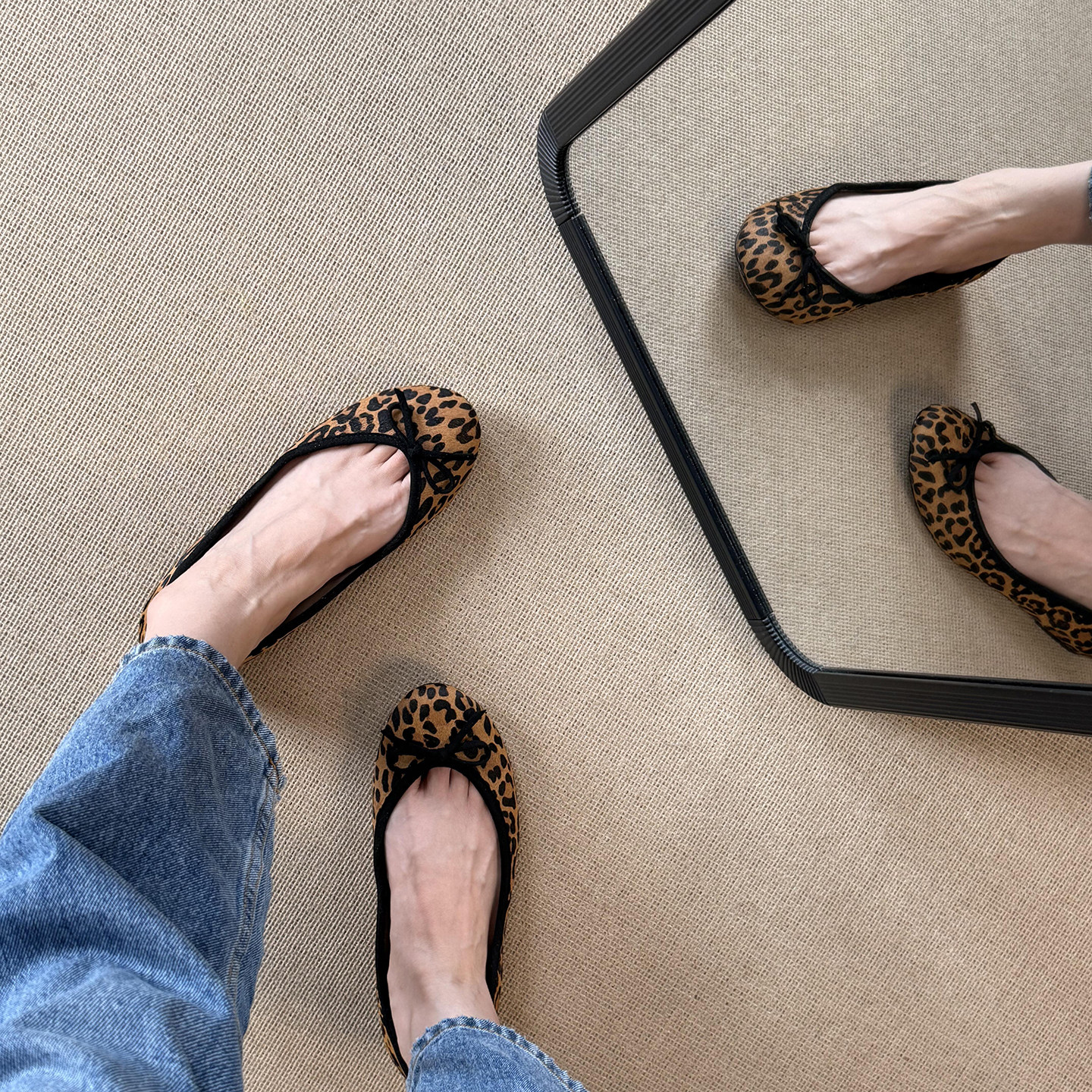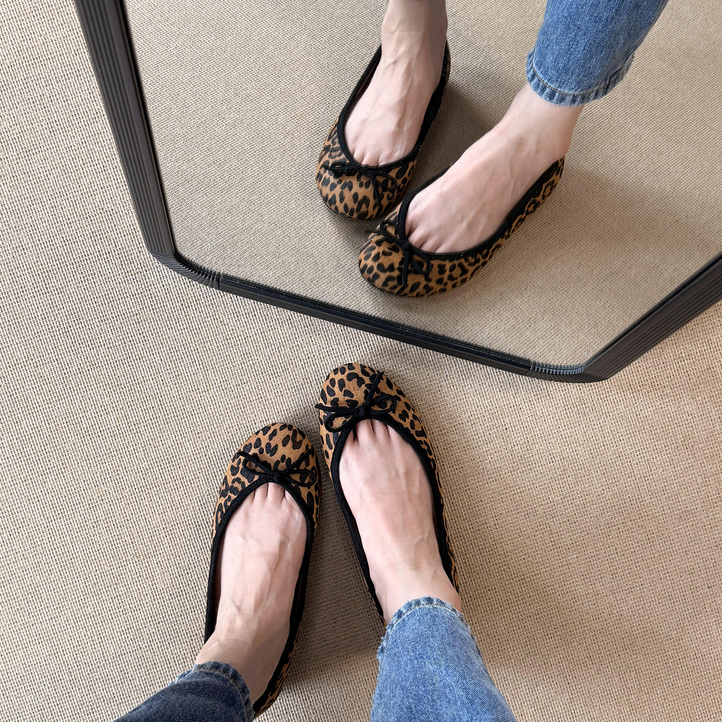 马毛版~超浅口露趾缝豹纹幼态芭蕾小单鞋女羊皮平底蝴蝶结奶奶鞋