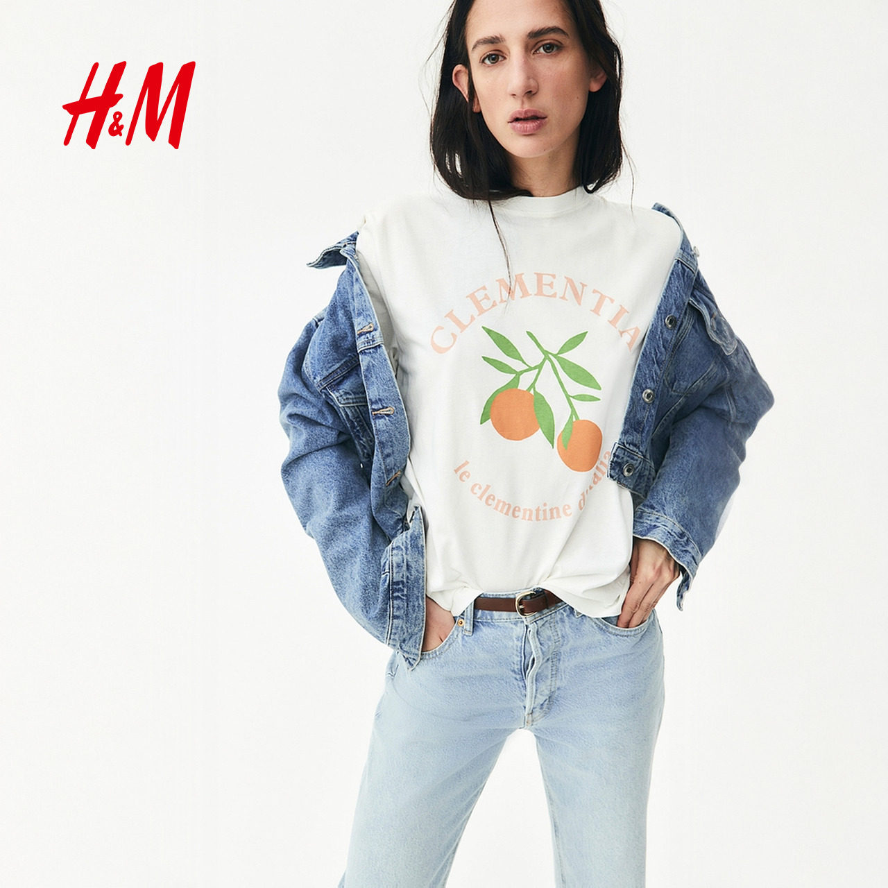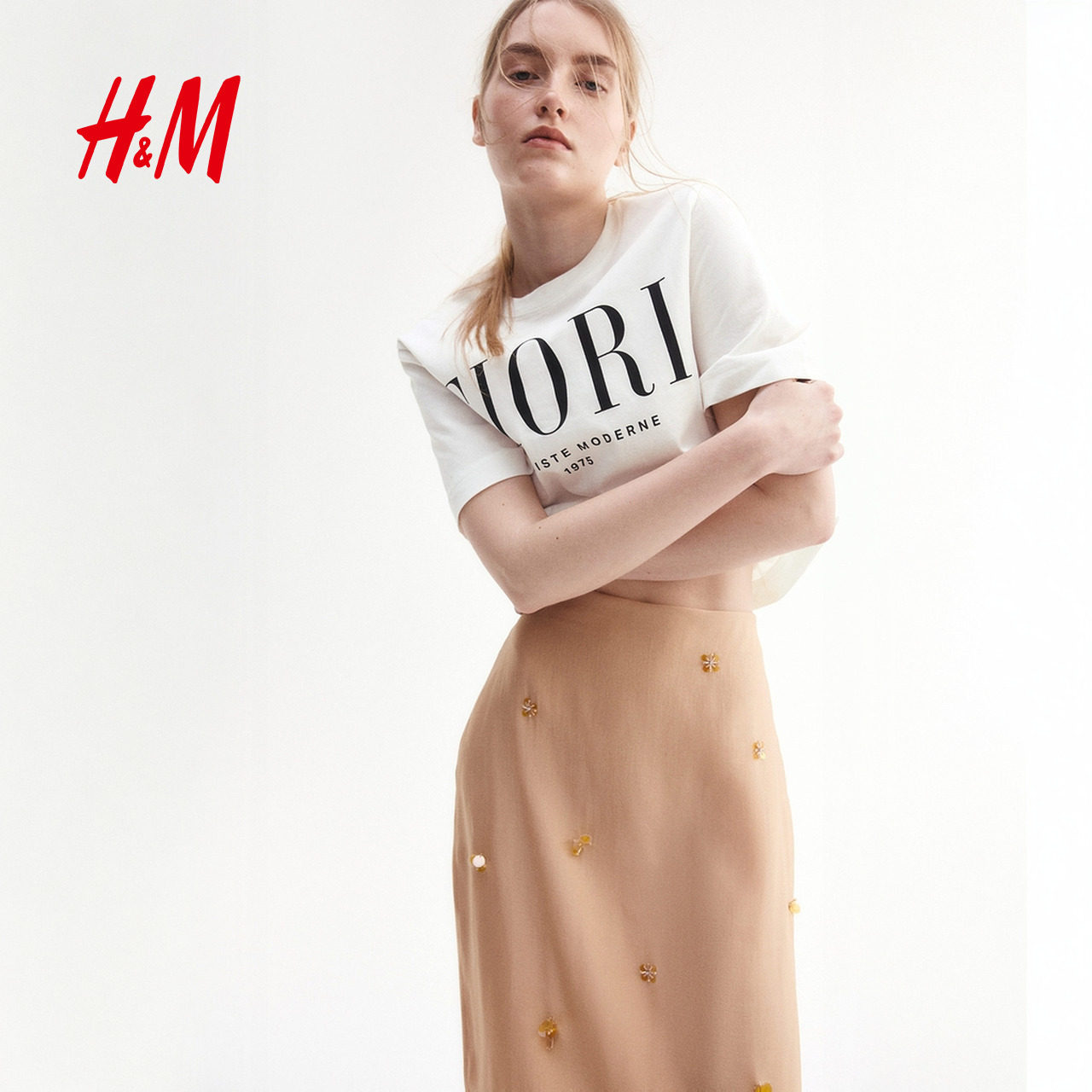 HM女装T恤春季美式圆领红色字母印花棉质短袖上衣1274171