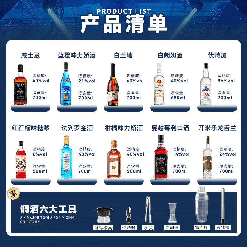 洋酒组合伏特加调酒基酒套装蓝橙味力娇酒朗姆酒金酒多规格