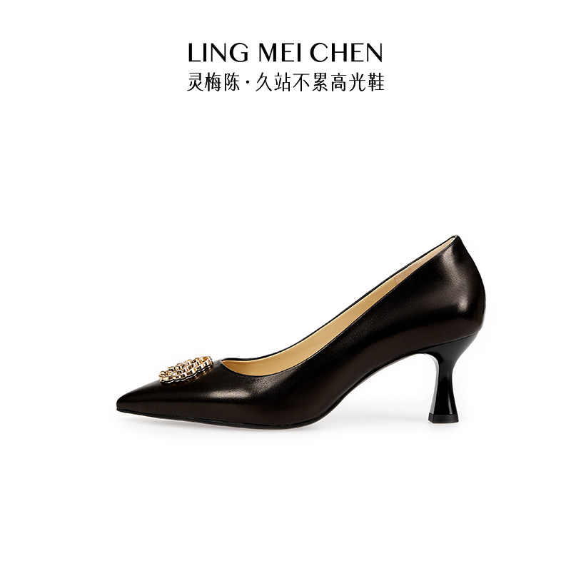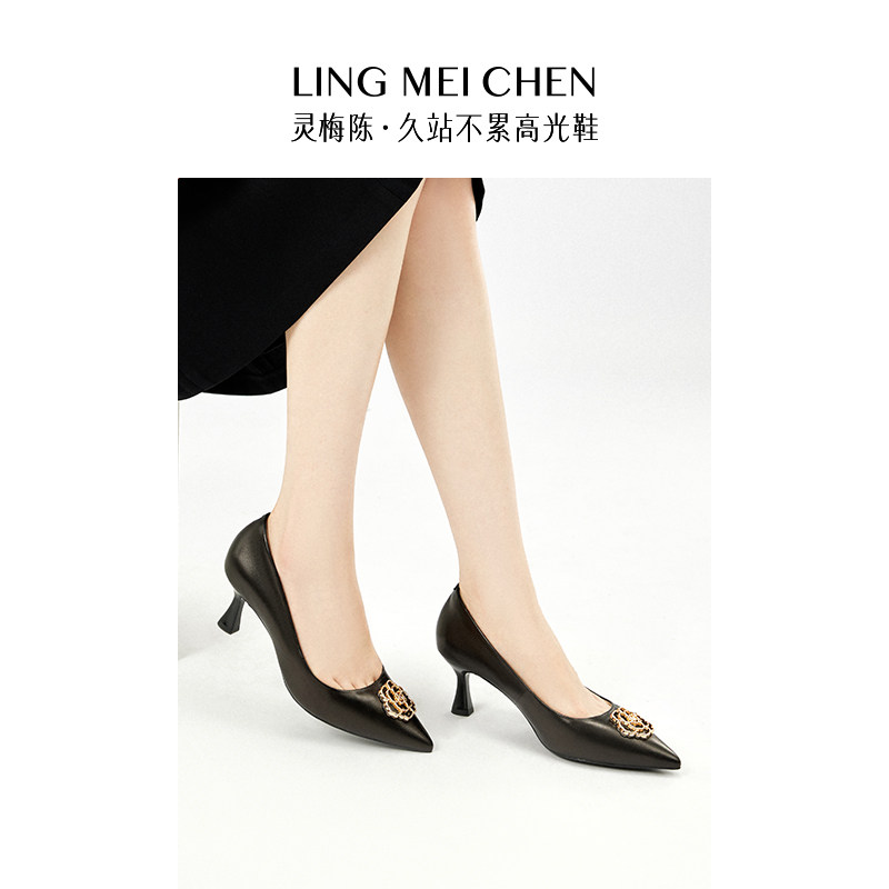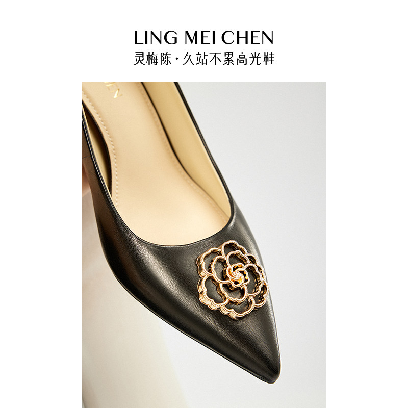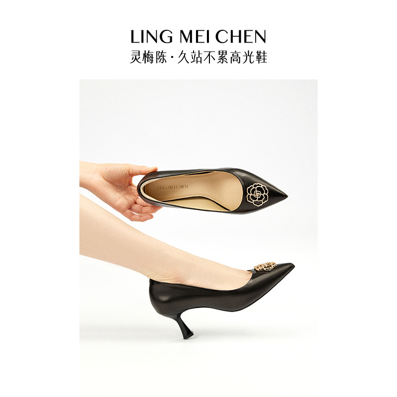 灵梅陈高光鞋牡丹鞋2025新款黑色尖头空气棉高跟鞋气质风旗袍鞋女