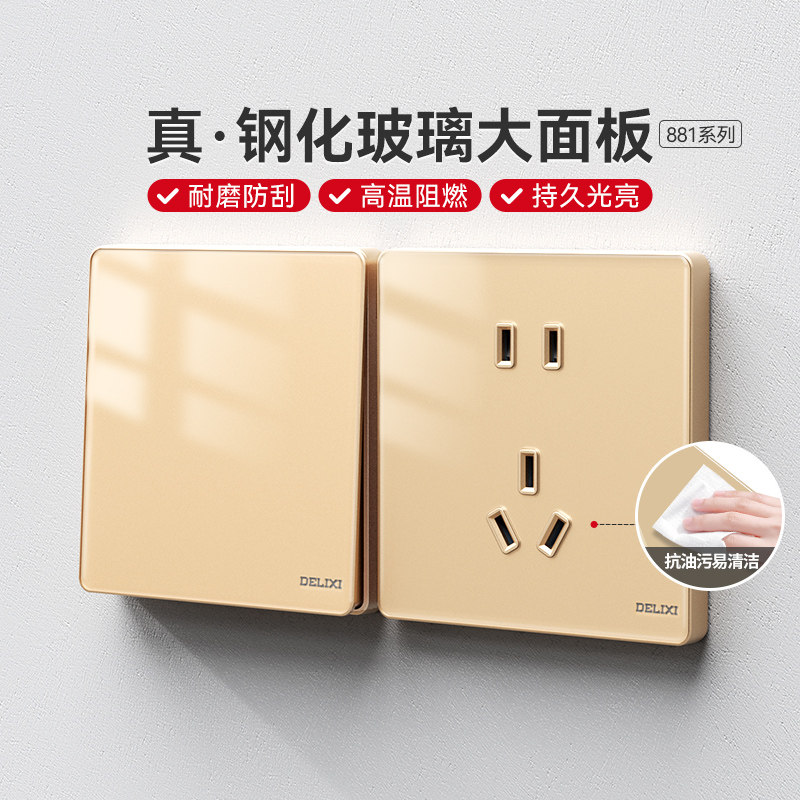 德力西官网86型三插一开五孔家用USB玻璃开关插座面板多孔881金