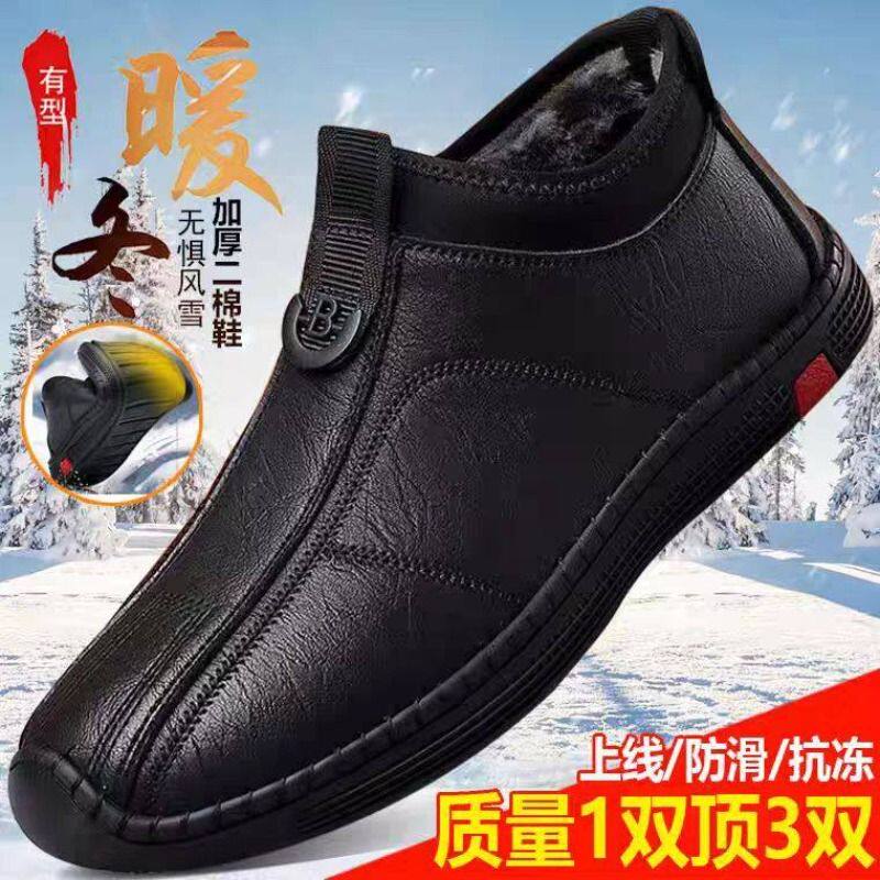 棉皮鞋男士秋冬加绒保暖中帮休闲男鞋软底防滑一脚蹬中老年爸爸鞋