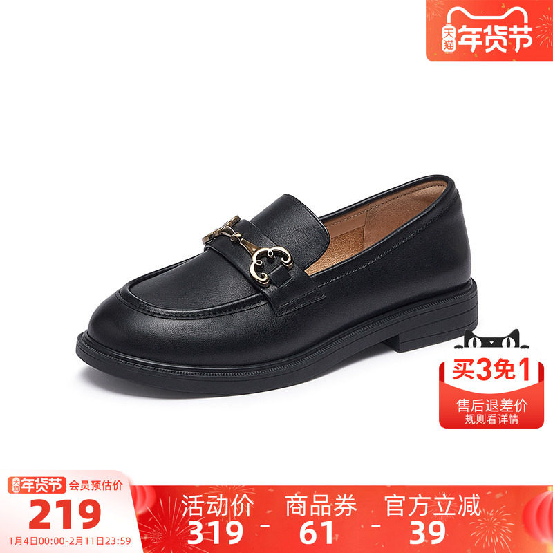 星期六真皮乐福鞋女山茶花新款秋季女鞋平底单鞋英伦风黑色小皮鞋