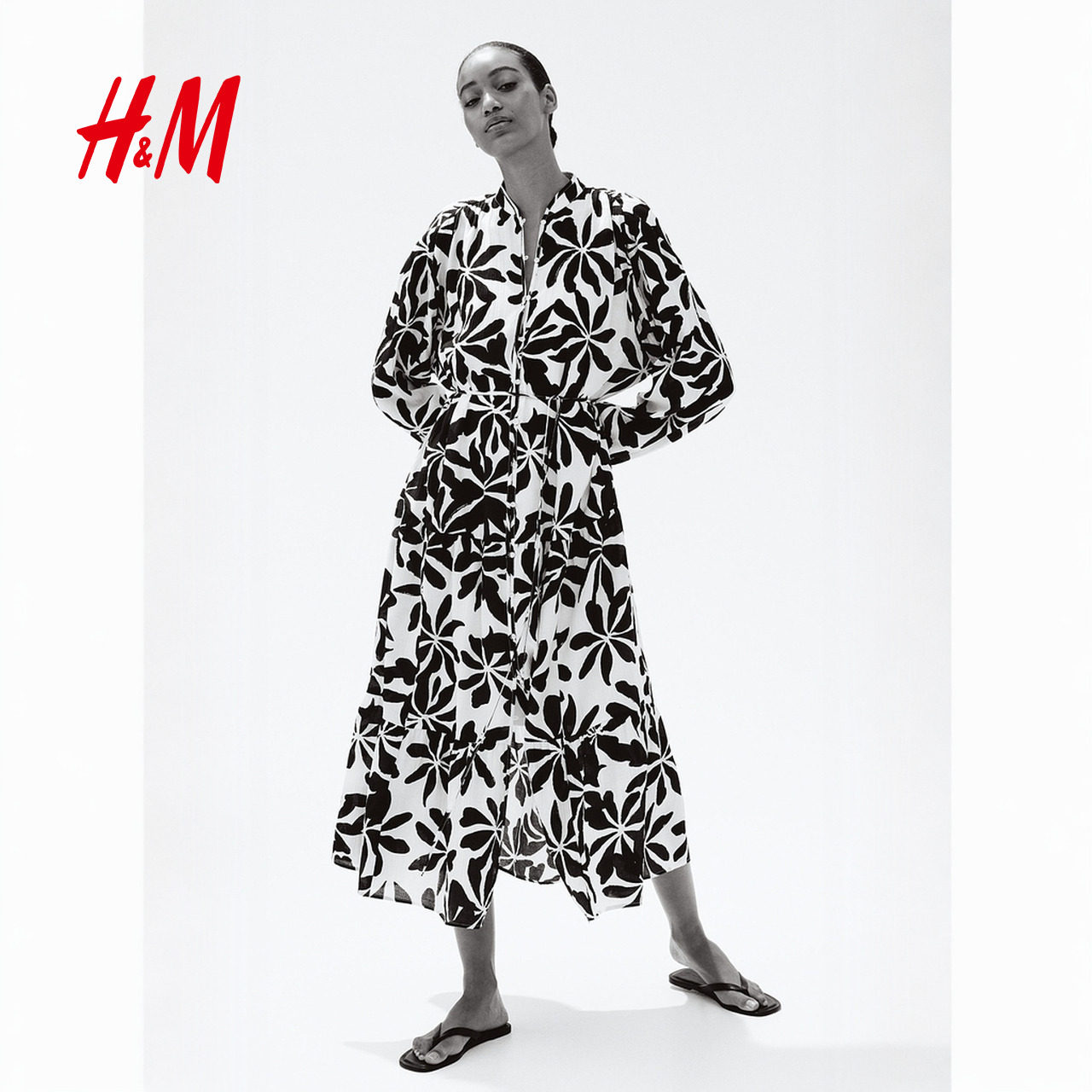HM女装连衣裙2025冬圆领优雅气质灯笼袖皱感植物印花长裙1219083