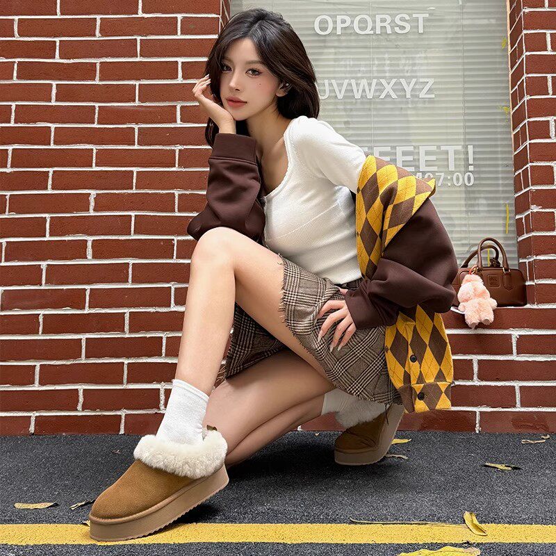 miu家厚底雪地靴女冬季真皮短靴羊毛侧拉链增高厚底加绒毛毛棉鞋
